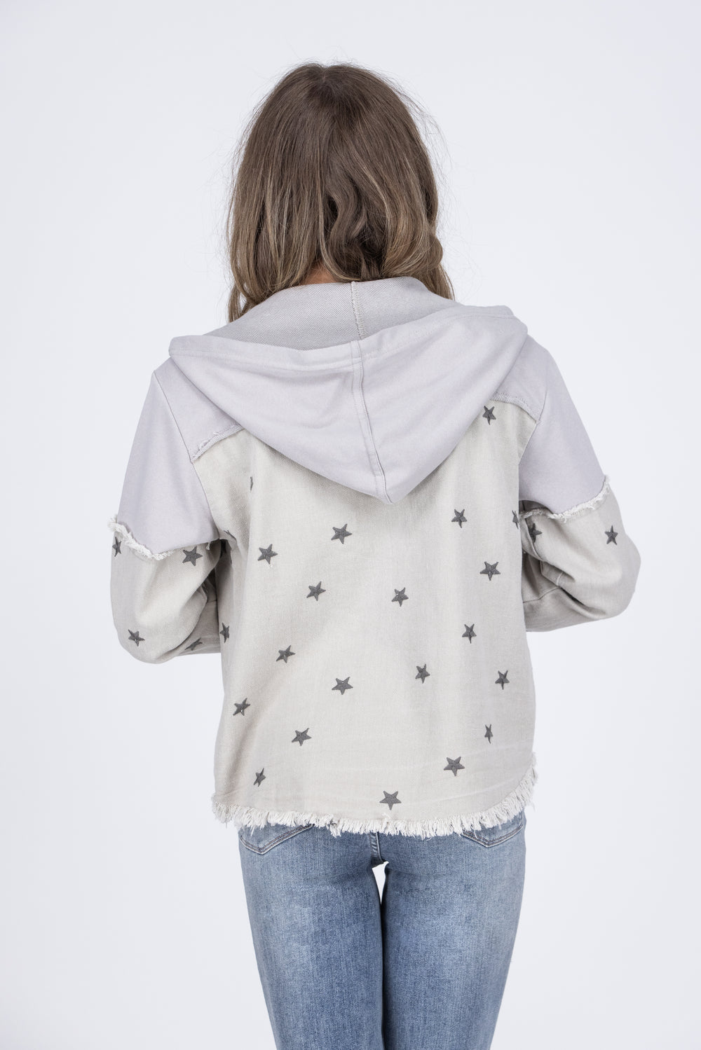 You'll feel like Dancing Amongst The Stars with this super stylish top from Heyson! This lightweight shacket features distressed seams and hem, embroidered stars all over, front square pocket and a drawstring hood. Wear over a tank top and pair with denim for a stylish layered look or wear it on its own with your favorite pair of skinny fit bottoms!