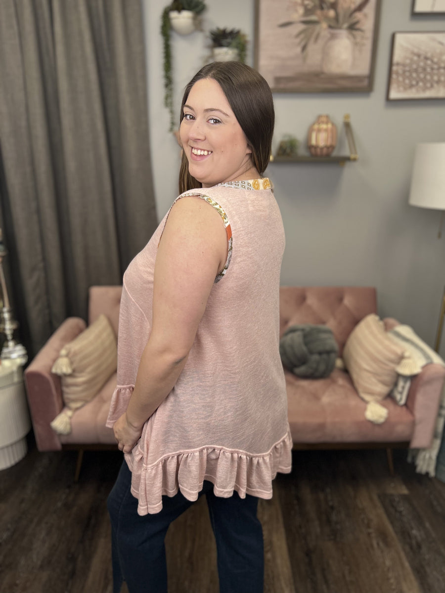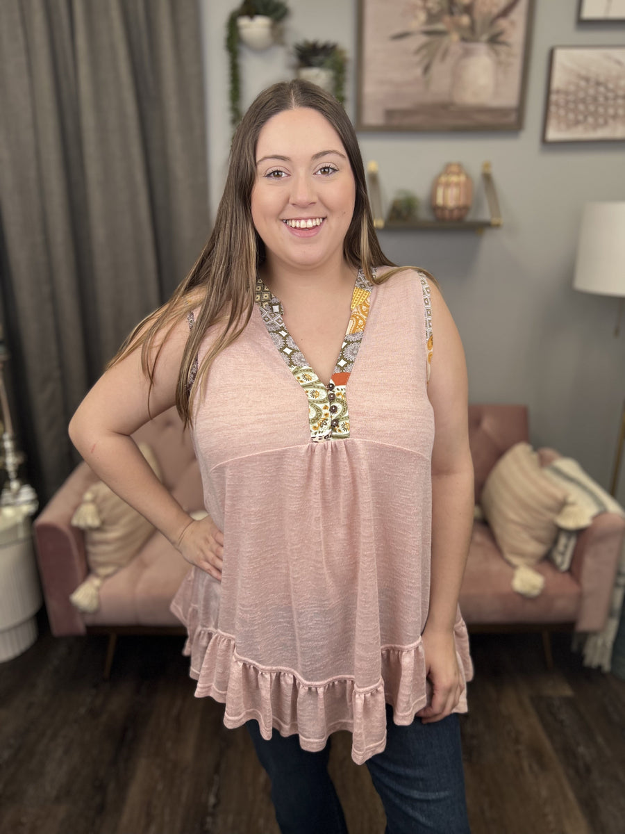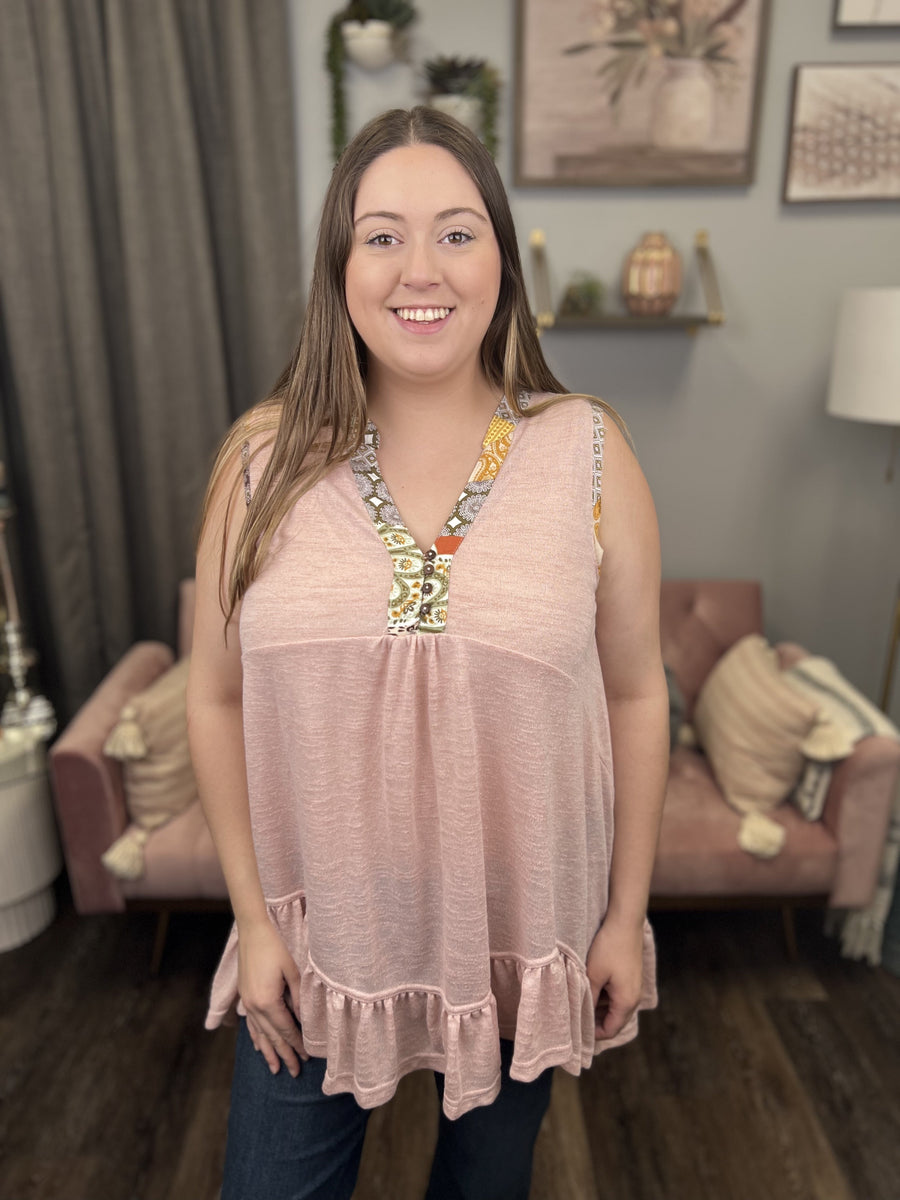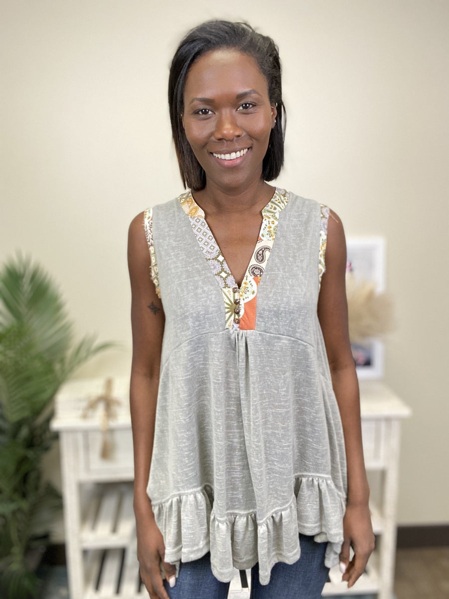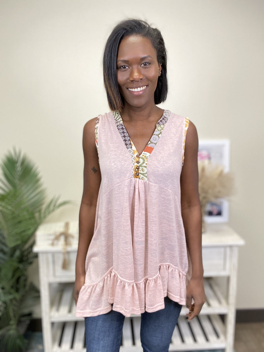 The Dare To Dream Top by Easel is a sleeveless tunic style with a darling ruffle hemline. This flattering fit is completed with a notched neckline and printed contrast along the neck and sleeve opening.