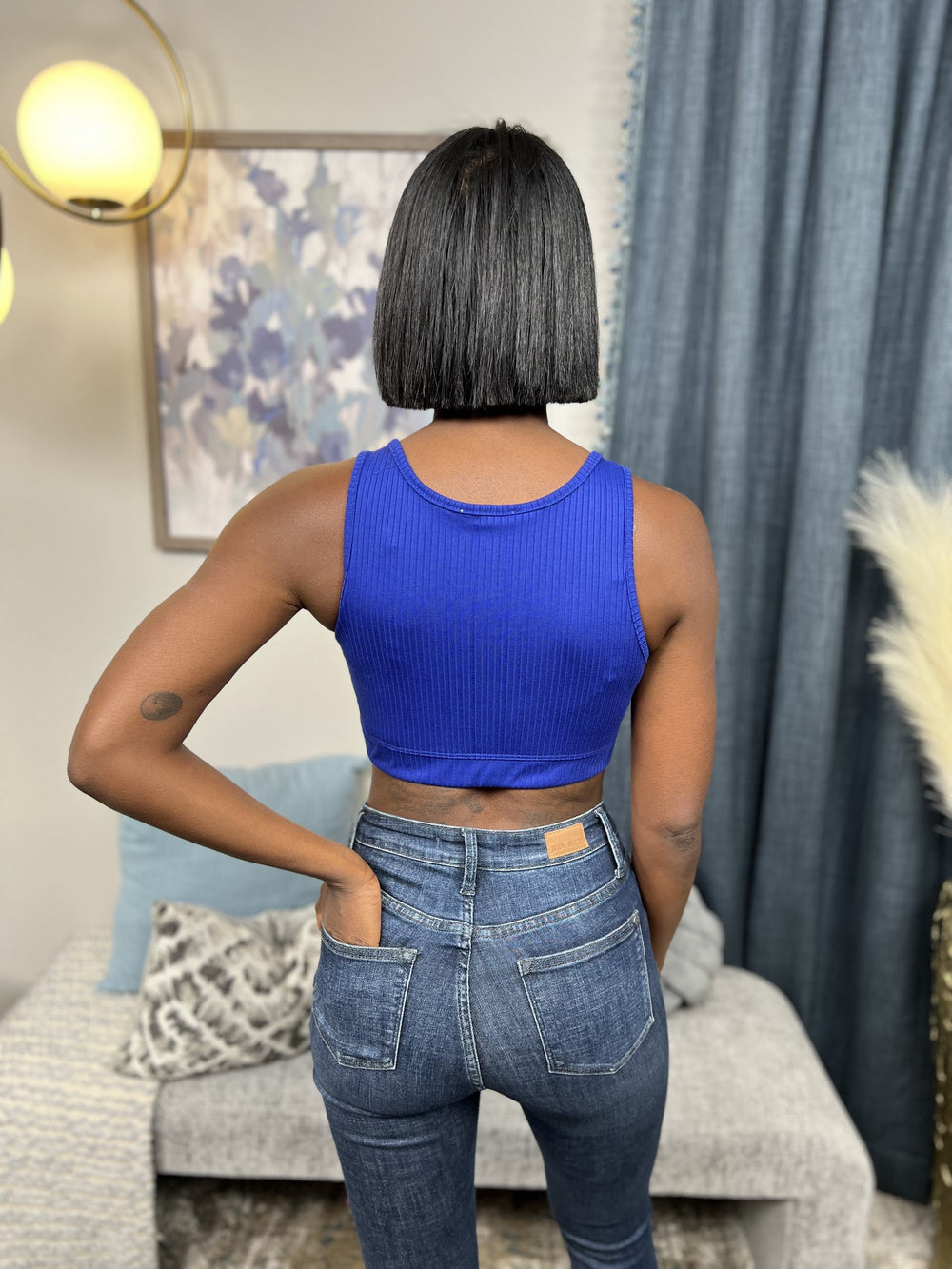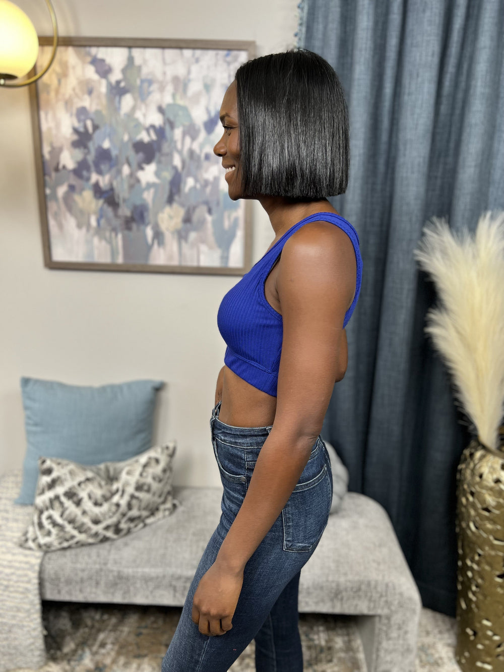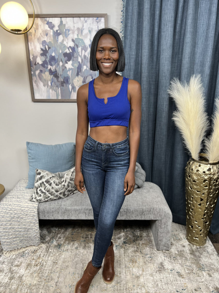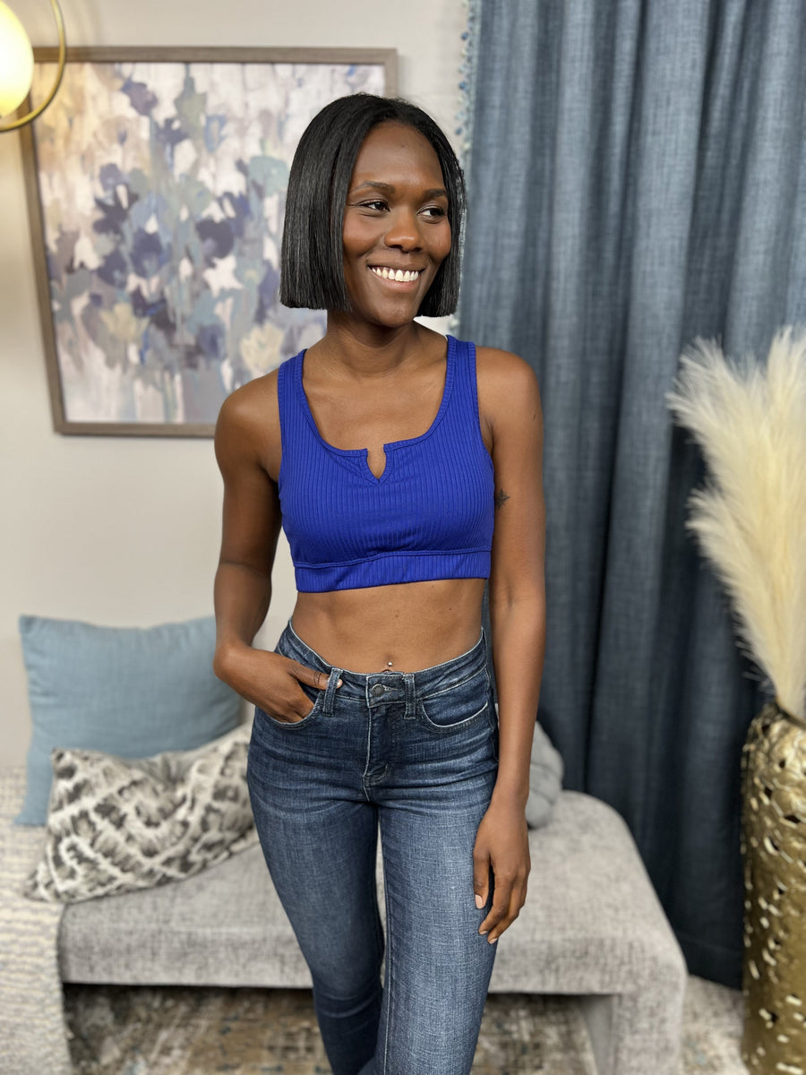 The Deep Ocean Bralette by White Birch is perfect for lounging at home. It features a U-shaped neckline with a notch, removable bra cups, an elastic hem and a lightweight ribbed fabric. Perfect to pair with sweatpants and a zip up hoodie for a cozy evening.