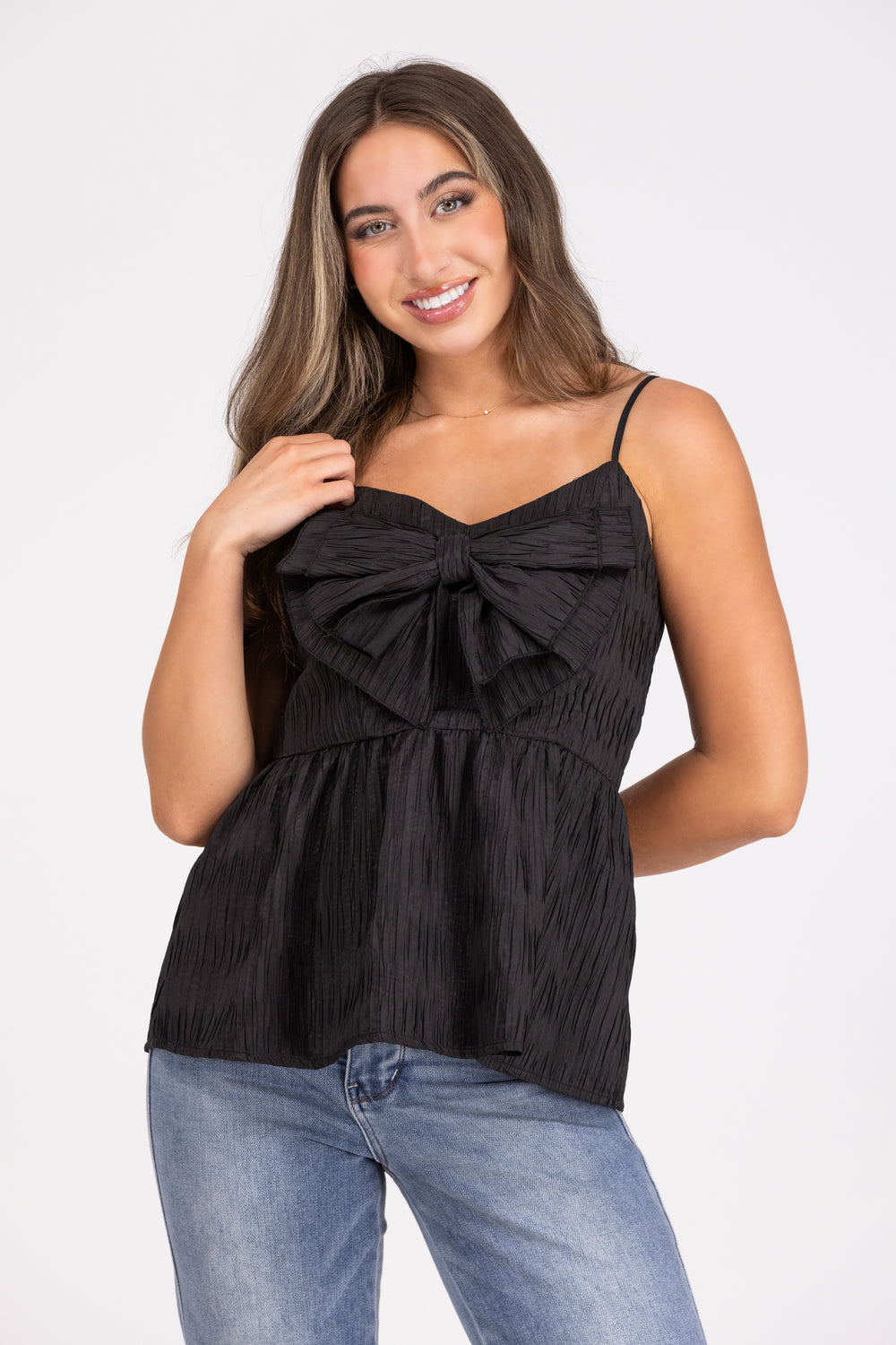 Show up in Don't Babydoll Me Tank Top by Heyson for a fun night out with your girls or an nice dinner with a special someone. Features empire waist, textured fabric, v neck, spaghetti straps, large bow detail on front, zipper back with hock and eye. Pair this with a nice pair of dark denim, skirt, shorts, heals or flats to take it from business day to fun night out.