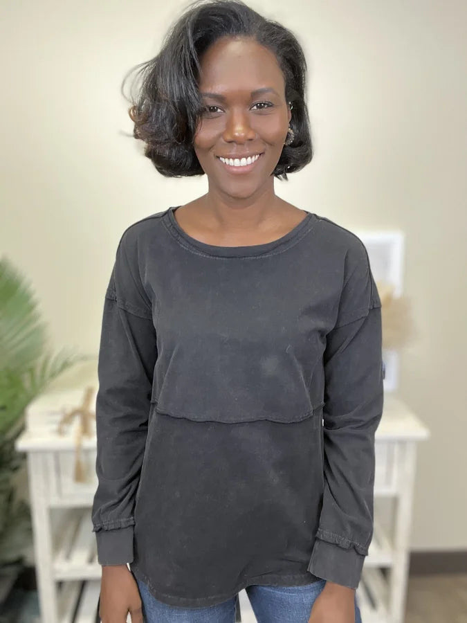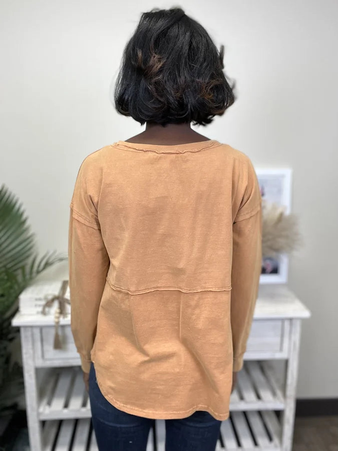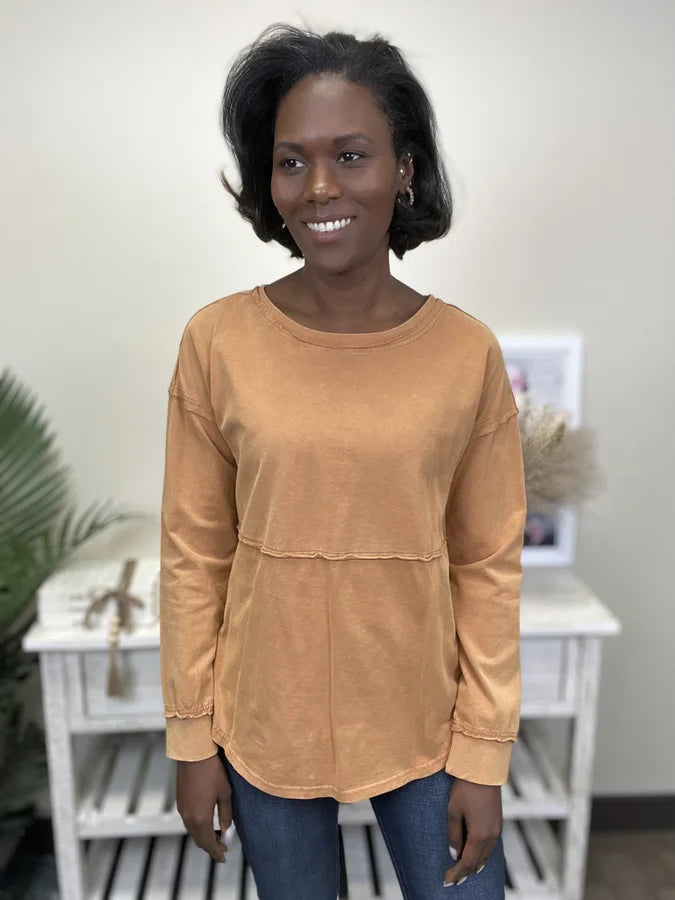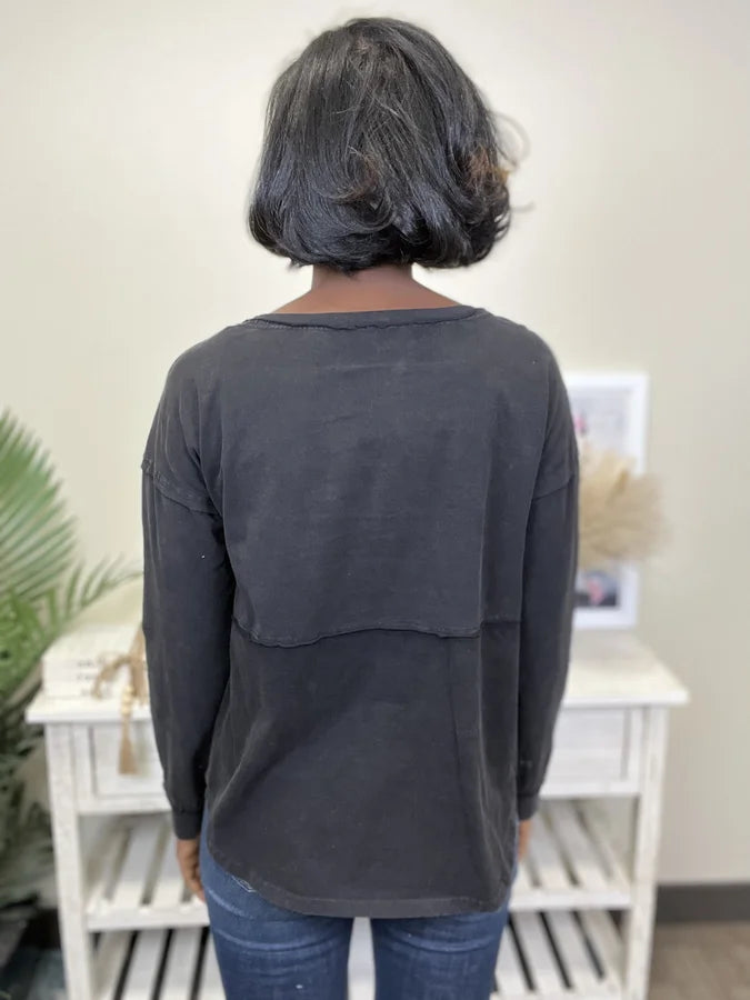The Don't Ever Go Top by Heyson is a classic long sleeve tee that will be a staple in your closet!  It features a rounded neckline, drop shoulder, raw edge detailing, and a rounded hemline.  Pair with your favorite distressed denim for a comfy cozy look.