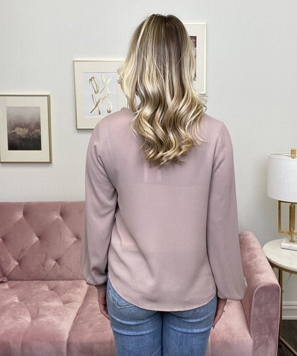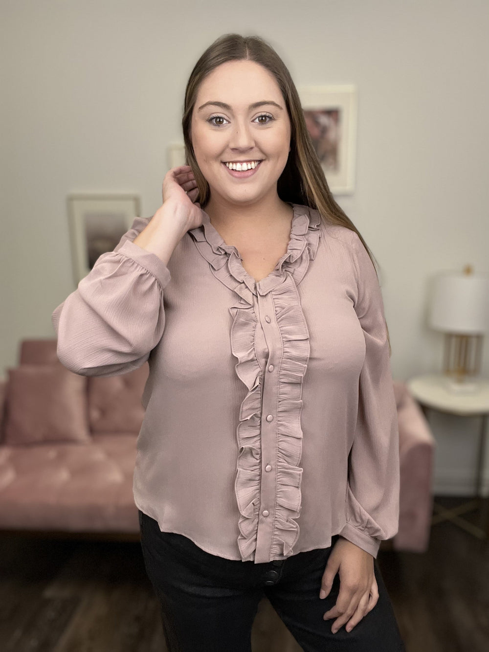 The Don't Matter Top by Andree by Unit is the type of top that no matter what you pair it with it looks good! It features a ruffled V-neckline, full front button down closure with ruffle detail, long cuffed sleeves, and a round hemline. This top can be sheer in the light, so you will want to wear something under it!