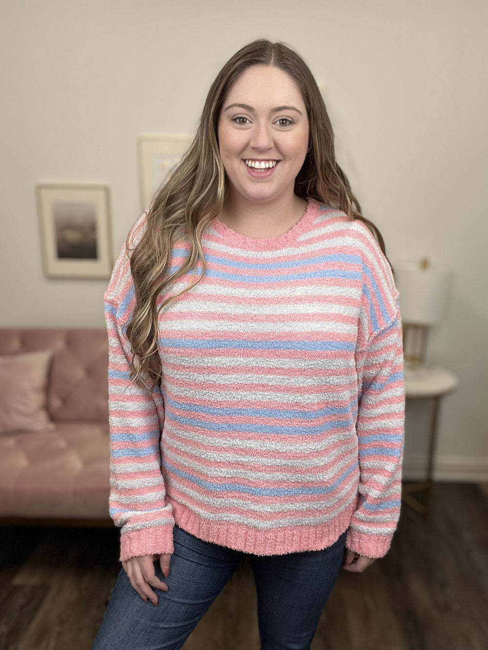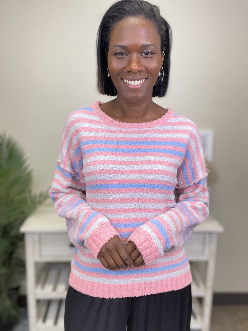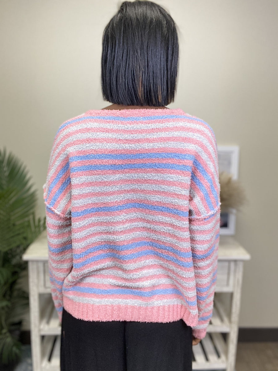 The Dreams Of Us Sweater By Easel is just what you need to add a pop of color to your closet! You can wear this sweater when out shopping it's coziness is sure to keep you warm! This sweater features a rounded neckline, drop shoulder, raw edge detailing, fuzzy knit, with grey, pink and blue stripes.