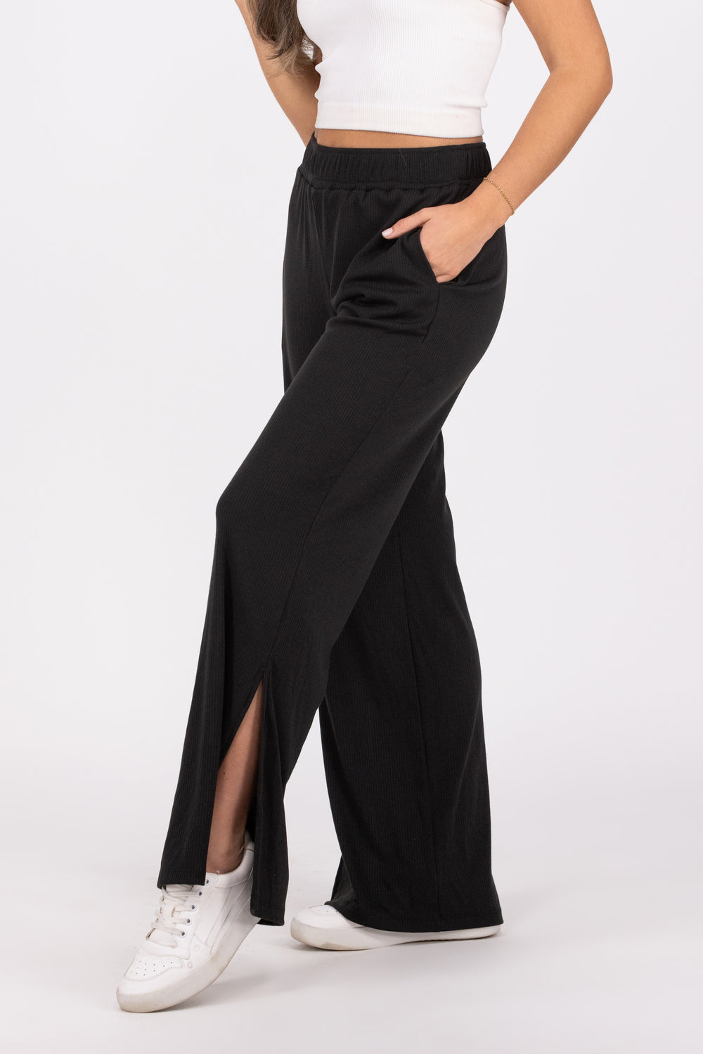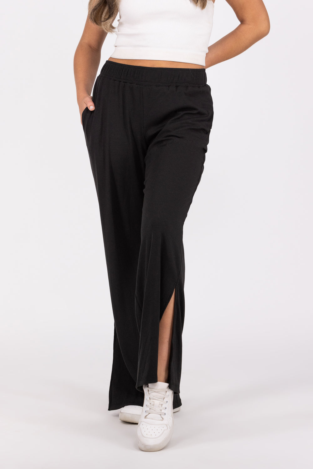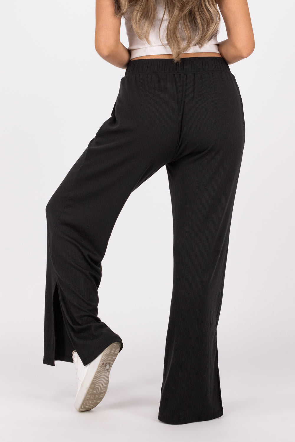 The Ease On Down Pants By White Birch are a high-waisted solid knit pant with an elastic waistband featuring an adjustable drawstring, side pockets and side slits along the hem!