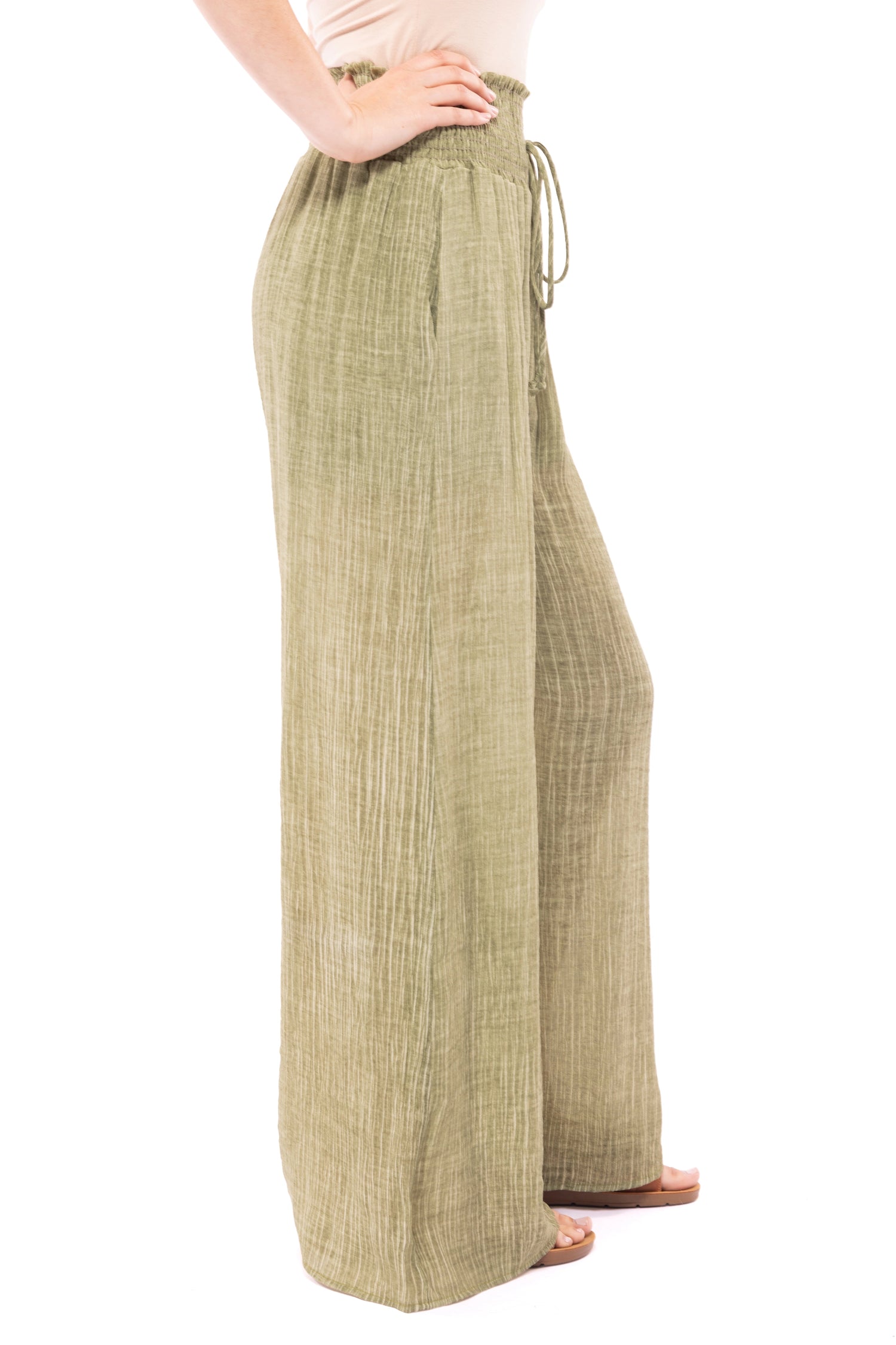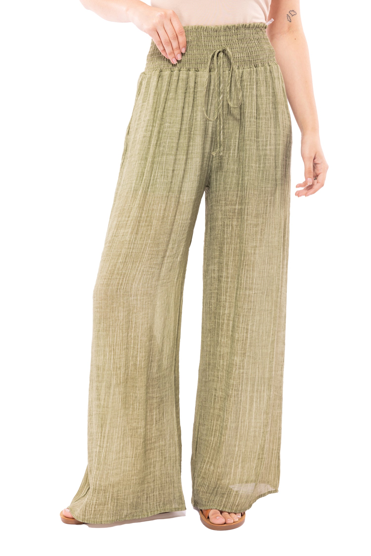 Escape The City Pants by GeeGee are Olive palazzo pants with an elastic ruched waistband with decorative ties and 2 functioning side pockets. Super light and super stylish, you cant go wrong with these pants.
