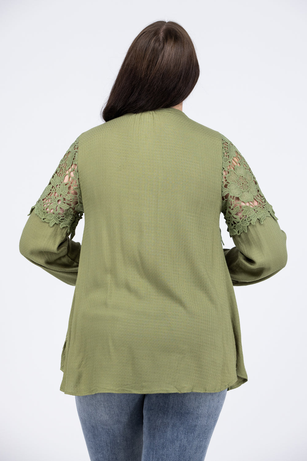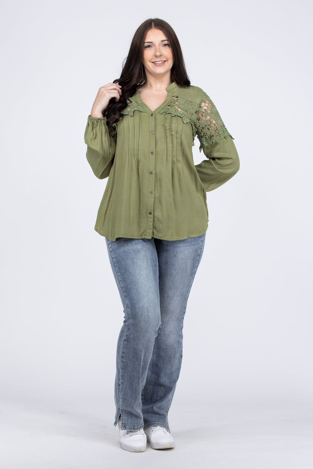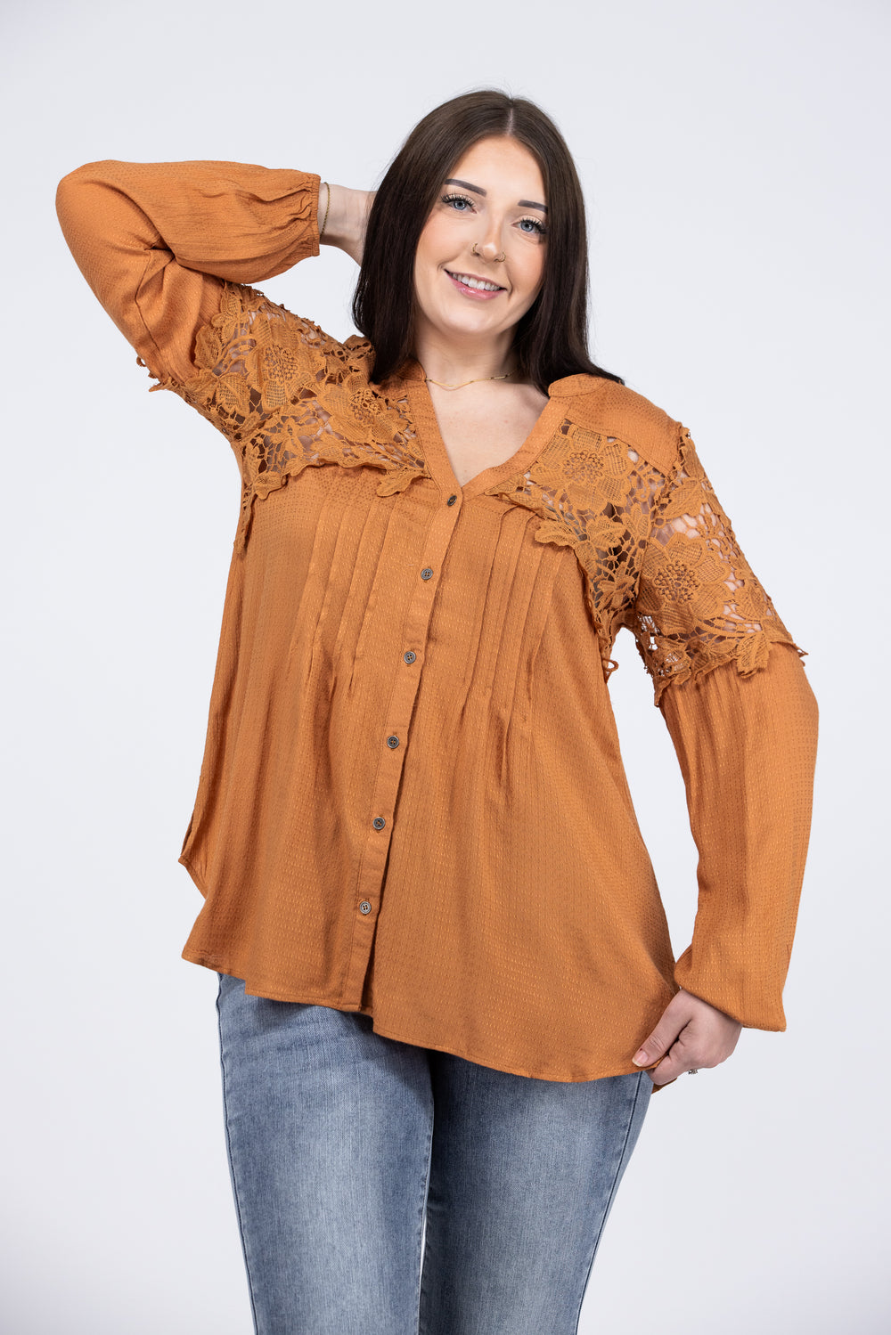 I definitely have my eyes on the Eyes On You Top by Heyson! It is a beautiful long sleeves top with peek-a-boo crochet detailing on the check and arms. The full front button closure means you can wear this top open or closed for different looks! It also features elastic puff sleeves and a round hemline! The fabric has square detailing that adds a subtle accent to this top!