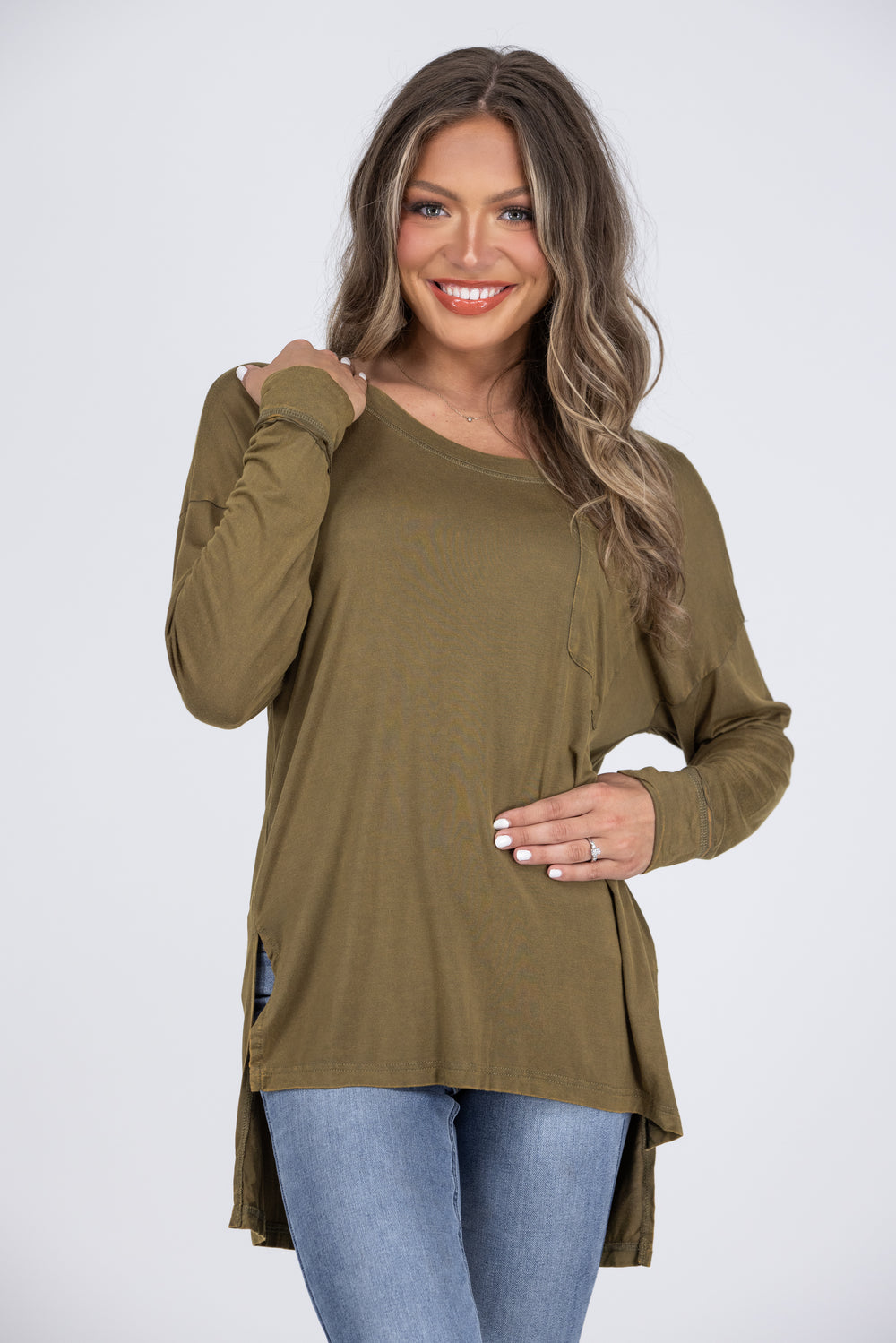 The Feeling Spunky Top by White Birch is a long sleeve solid knit top with a scoop neck featuring a front patch pocket and side slits. The fabric is a lightweight mineral wash knit. This top will have you Feeling Spunky no matter how you style it!