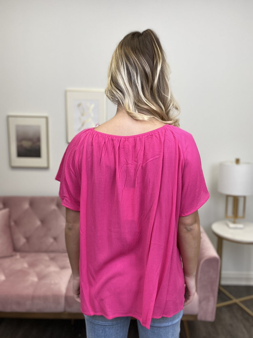 The Fiercely Myself Top by 143 Story will give you the confidence you need to get through your day! This lightweight top features a round elastic neckline, smocking detail, short flowy sleeves, and a rounded hemline. This Top is flowy and will pair very nice with any denim of your choice!