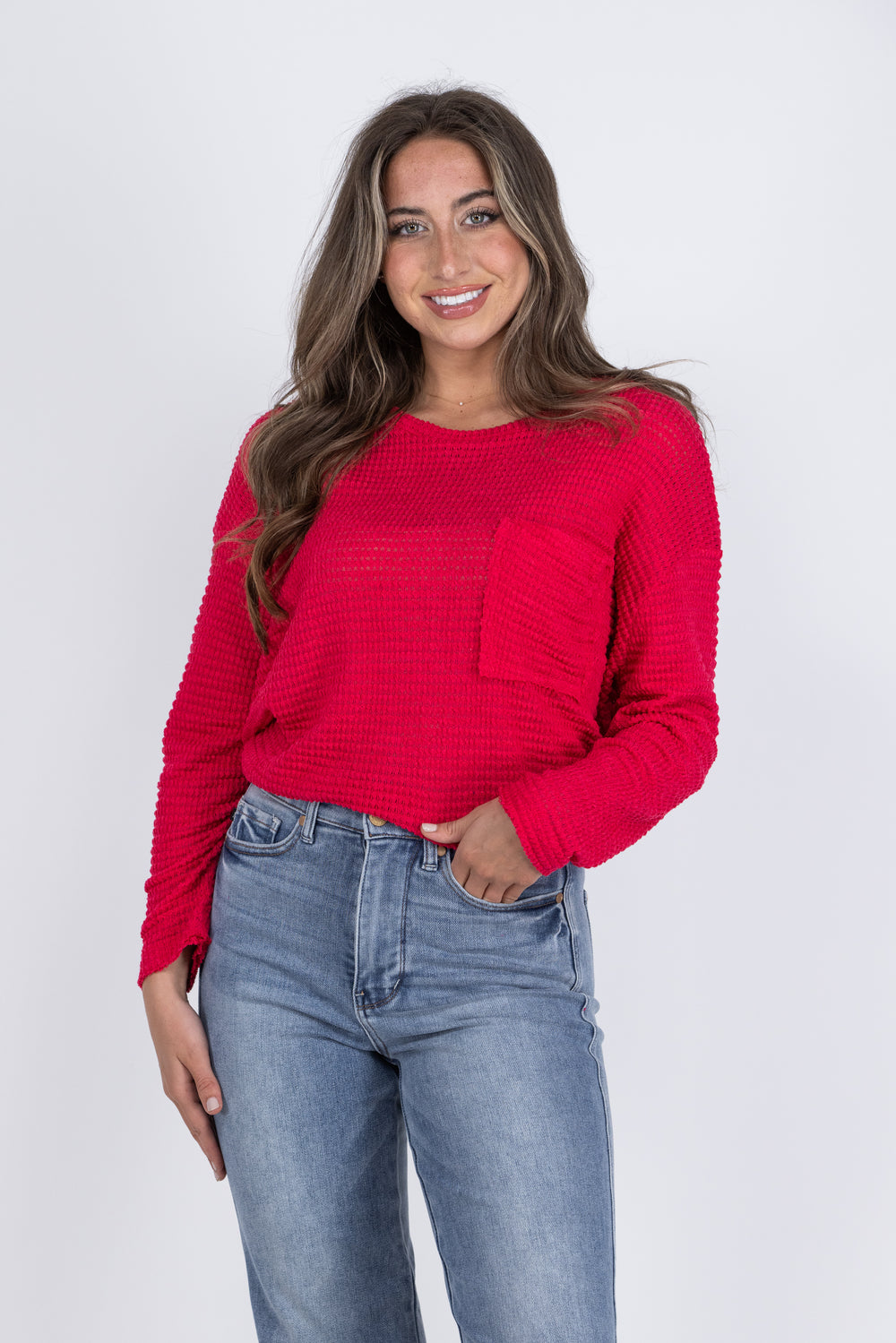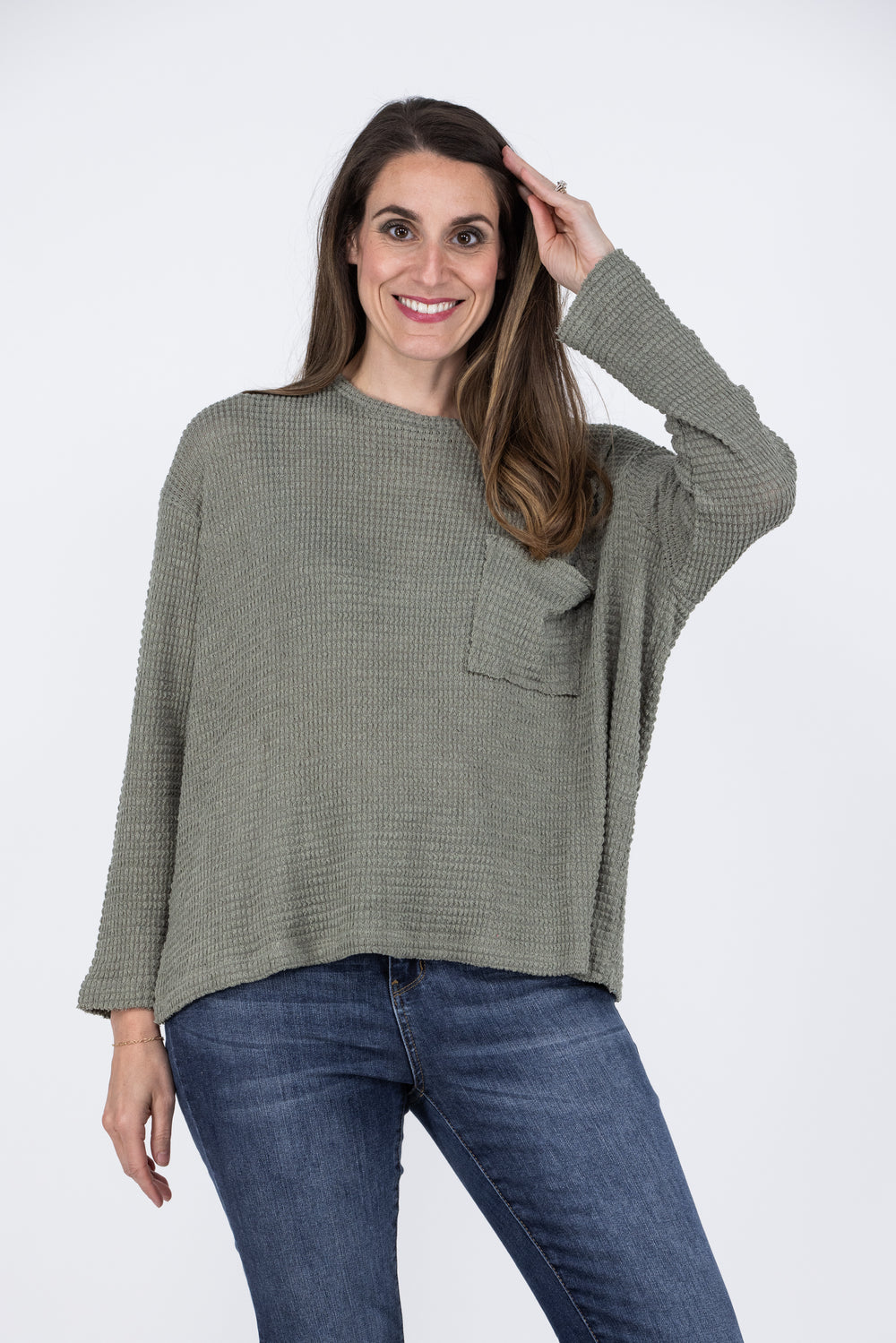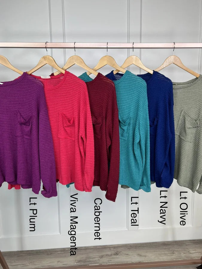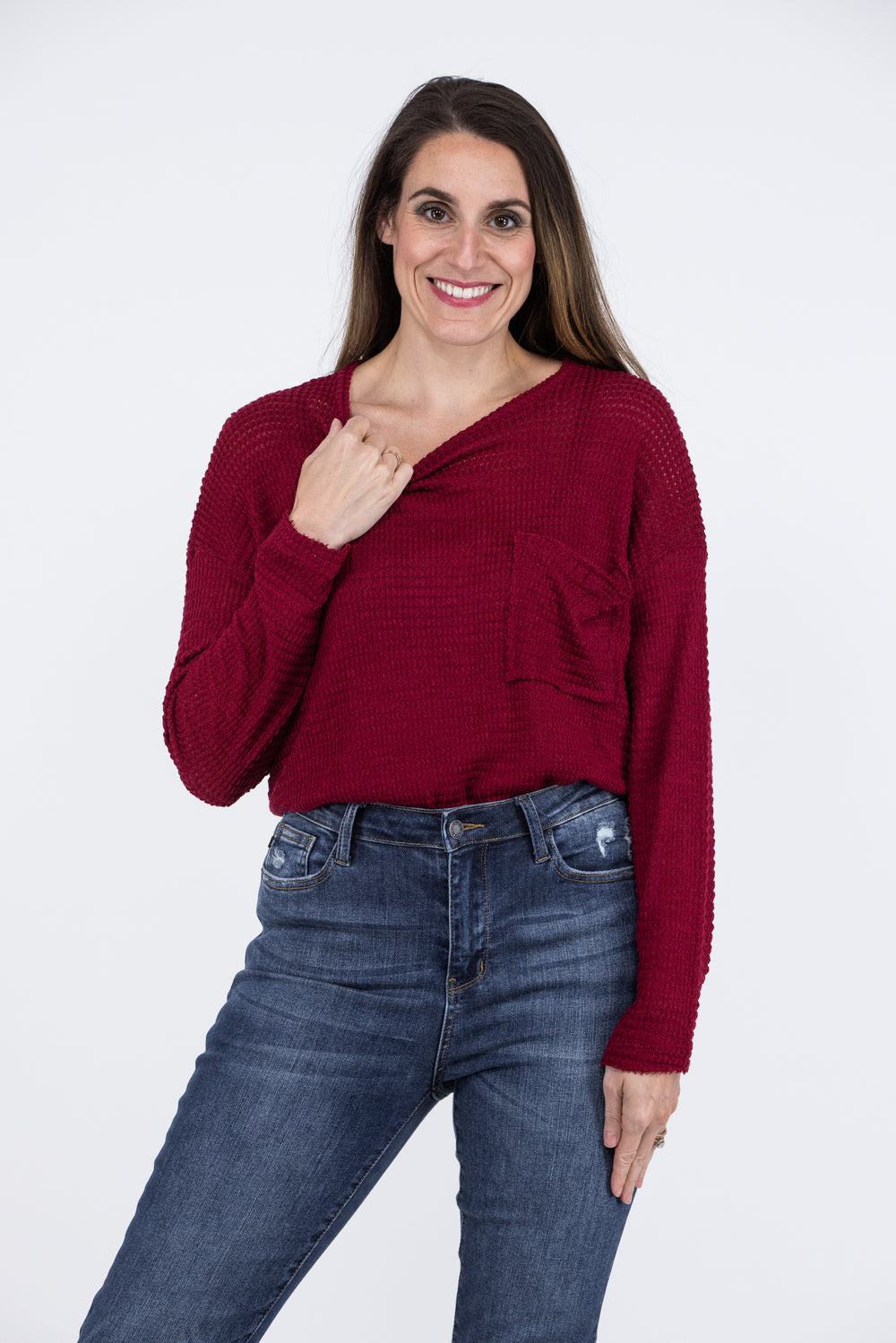 You'll Find Serenity when you wear this lightweight top from Zenana! The Find Serenity Long Sleeve  Top features an open waffle knit fabric, a front pocket and drop-shoulder stitching. This top makes for an excellent piece of loungewear or wear with jeans and sneakers for a more casual look.