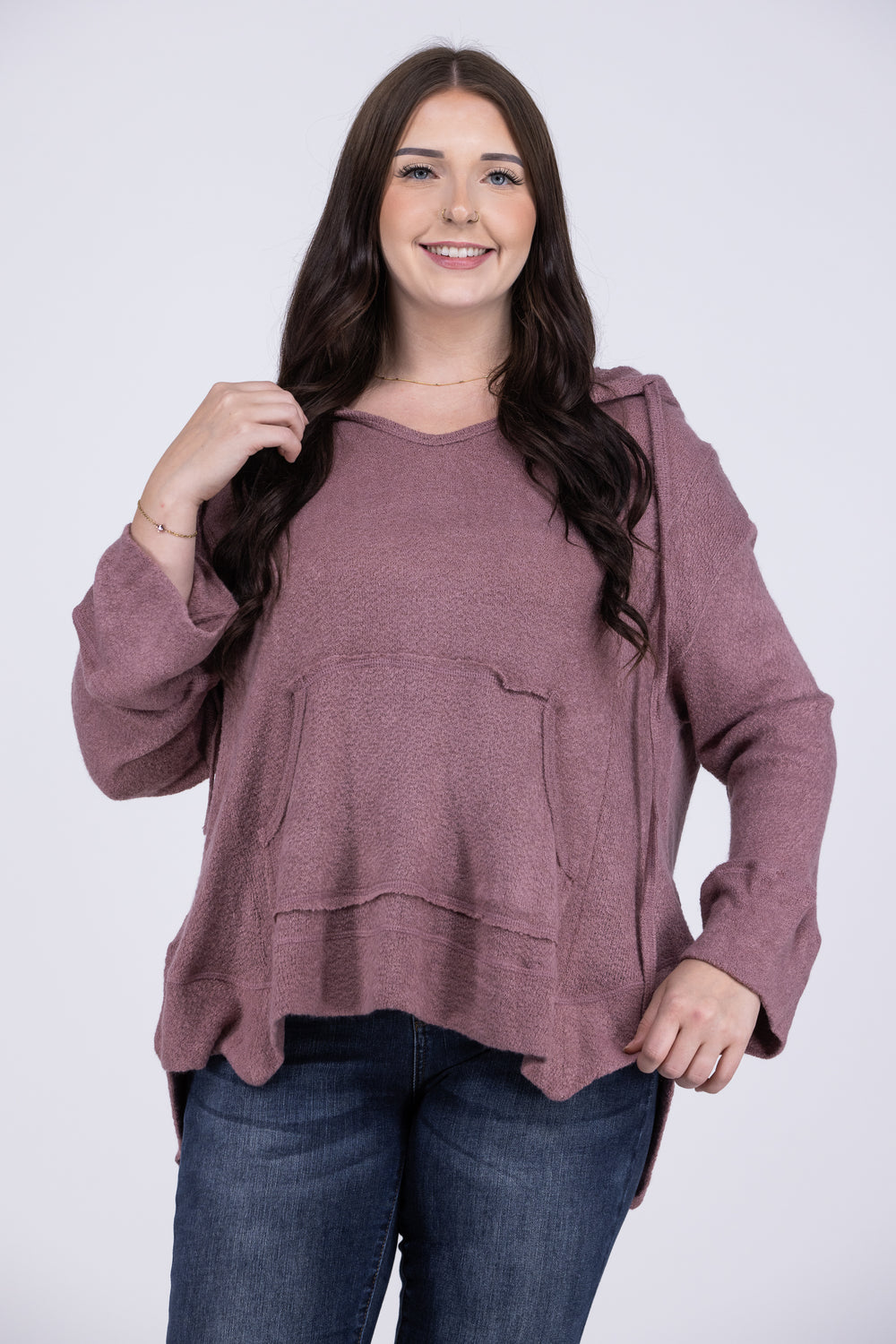 The Find You Well Top by Easel is a solid sweater top. It features a textured brushed knit fabric, hoodie with drawstring, long sleeves, V neckline, front pouch pocket and a scalloped hemline. Pair with your favorite leggings and Very G Gypsy Jazz shoes for a laid back look!