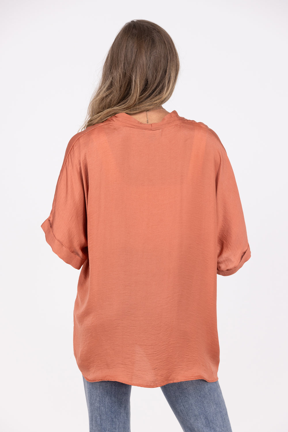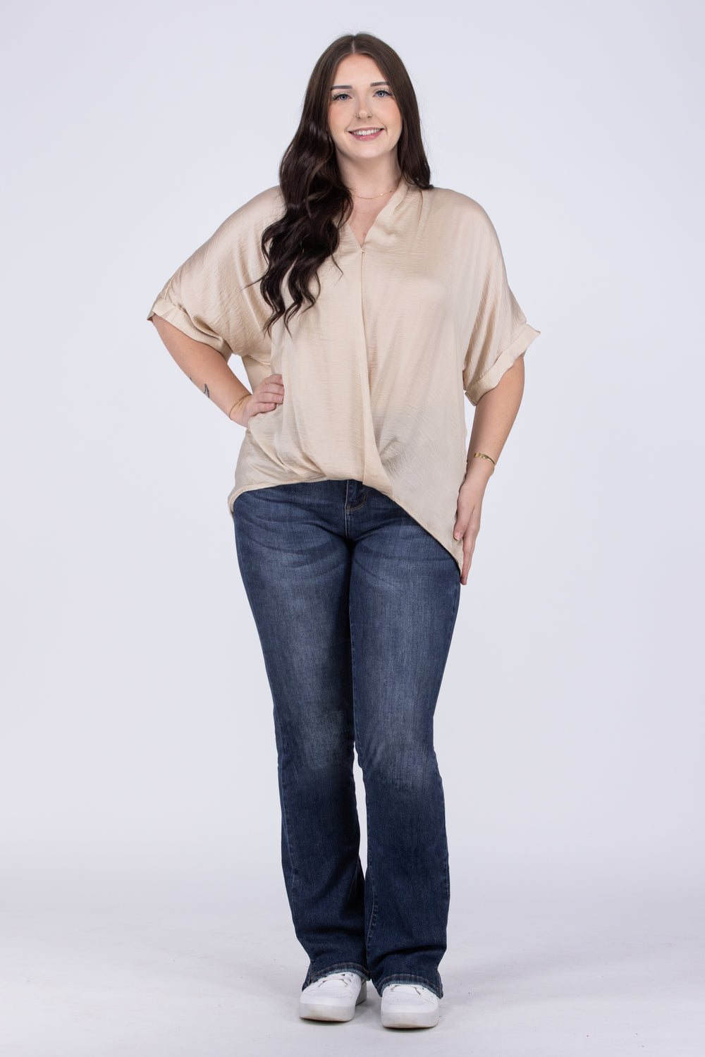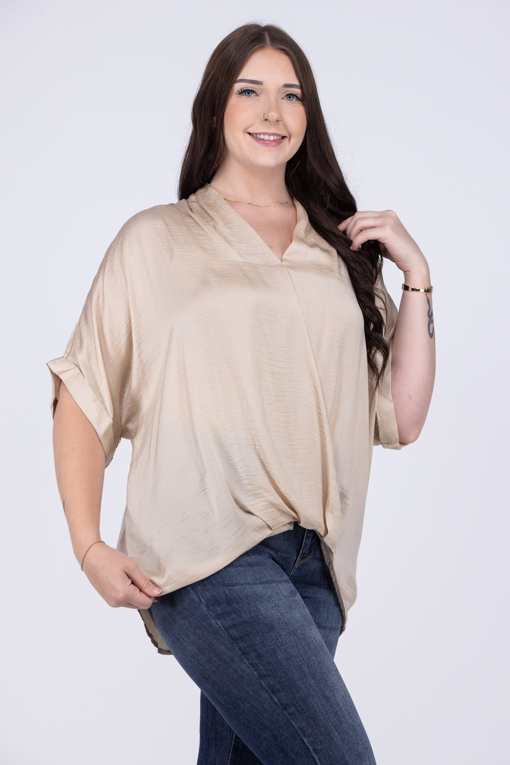 The Find Your Happiness Top will have you feeling happy every time you wear it! This crinkled top features a surplice, dolman styled sleeves and a hi-lo hemline! The Find your Happiness Top can be worn for any occasion.