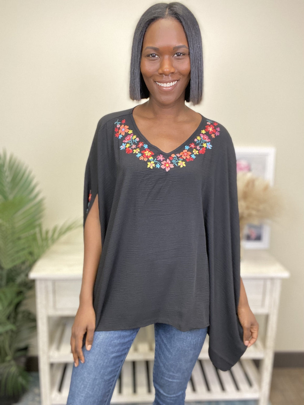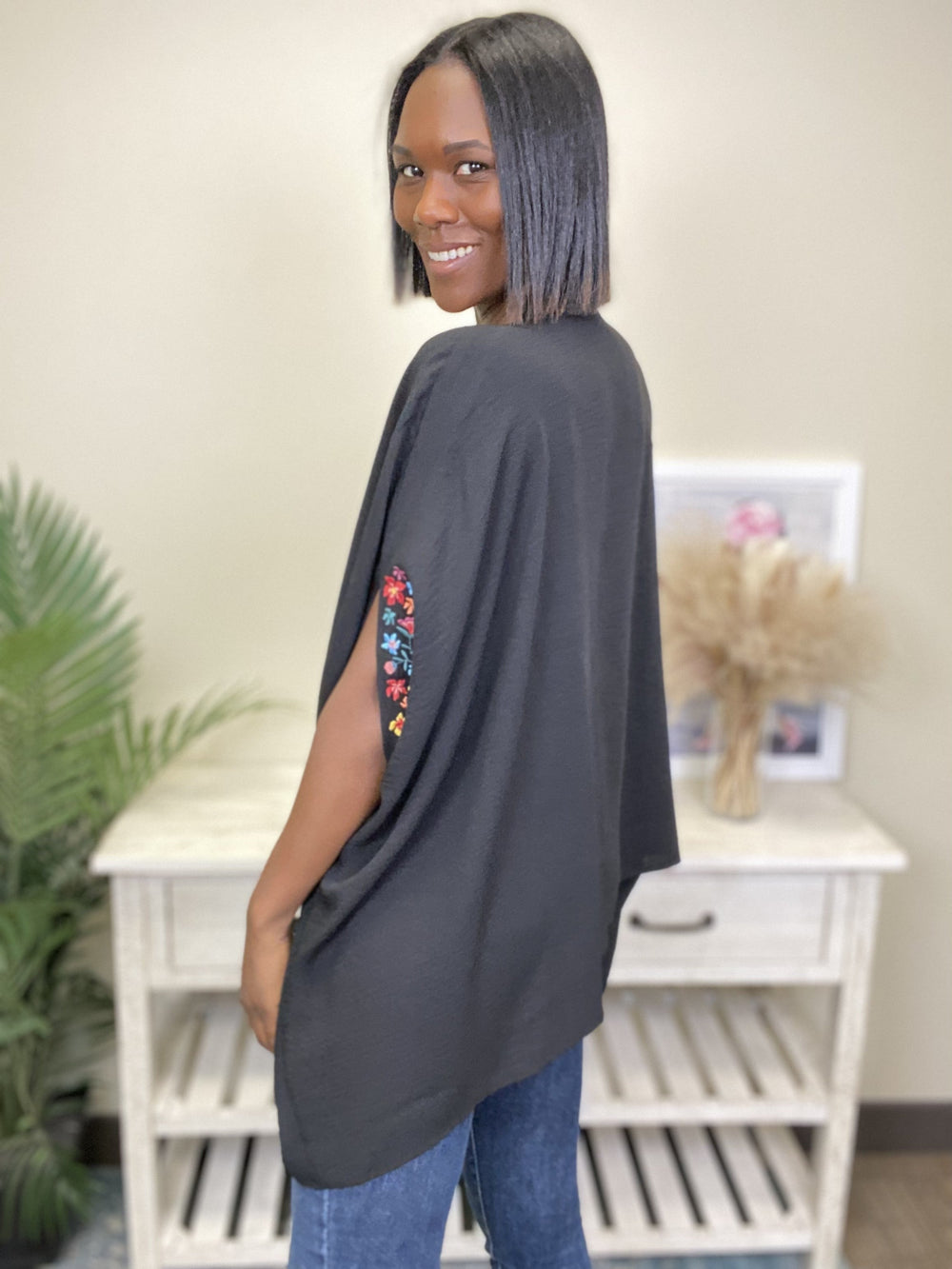 The Flower Child Top by Oddi is a solid woven poncho, featuring a v-neckline, a shark bite hem, and a floral embroidery around the neckline and sides. Lightweight, easy to wear, non sheer.