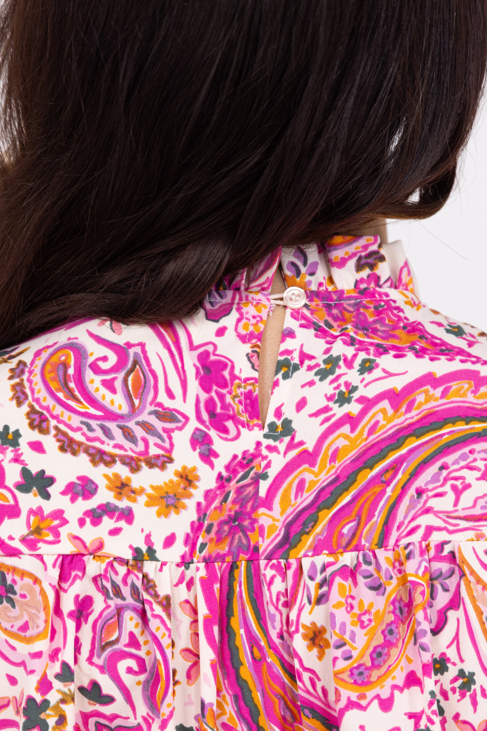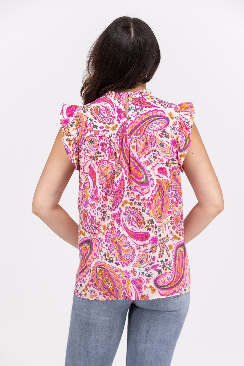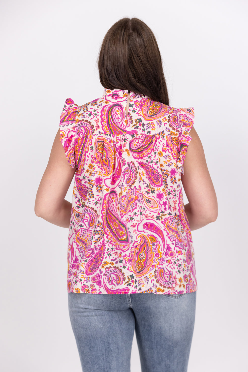 Let the good vibes flow in the Flowing Floral Top by Bibi. It features a high, rounded neckline with ruffled collar, a keyhole back with a button closure, is sleeveless with a ruffle detail and has smocking across the chest. Pair with dark denim and a pair of wedges for the perfect day time date outfit.