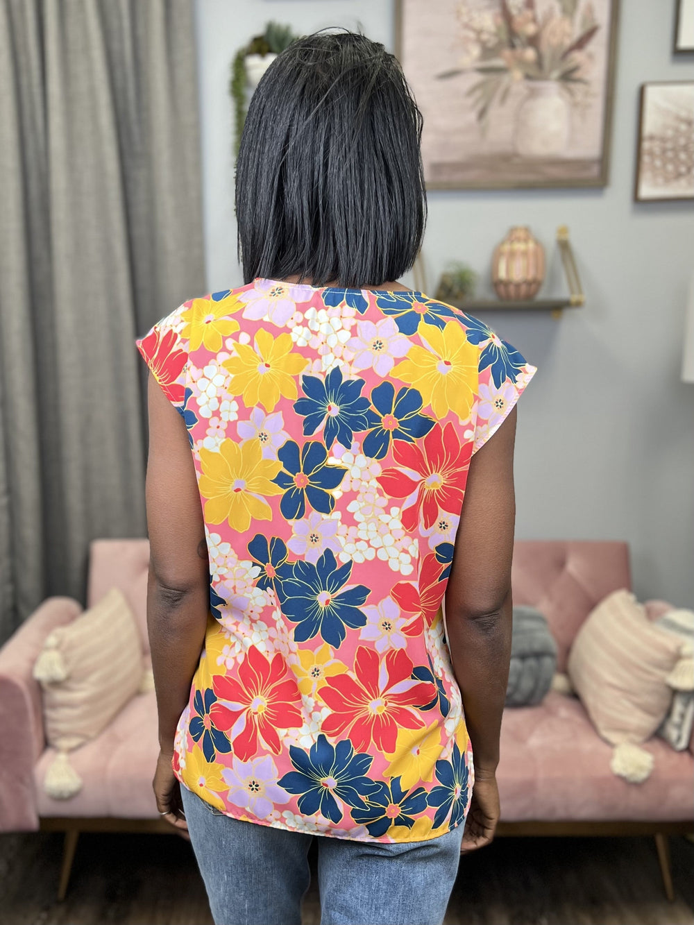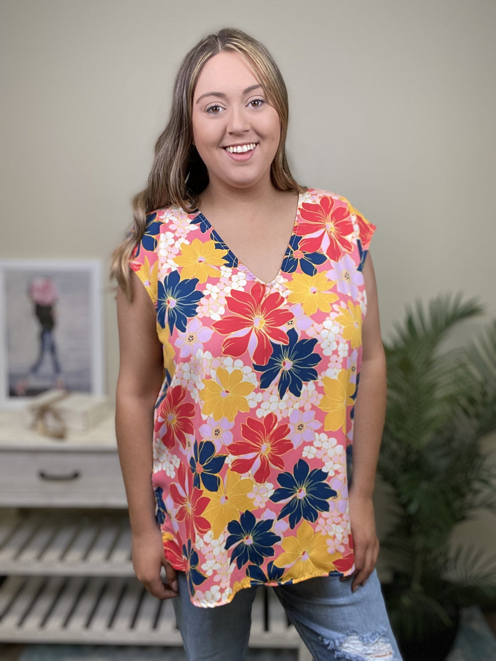 The Flying Petals Top From Andree By Unit is the perfect way to add a summer touch to your outfit, from dressy to casual ensembles! This sleeveless top features a v neckline, straight hemline and flattering side slits. Pair with your favorite white denim or even dress casual bottoms for a day at the office!