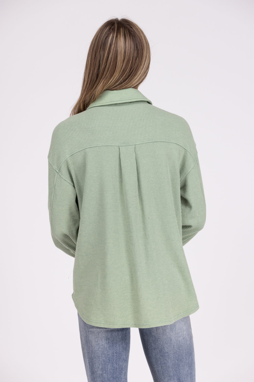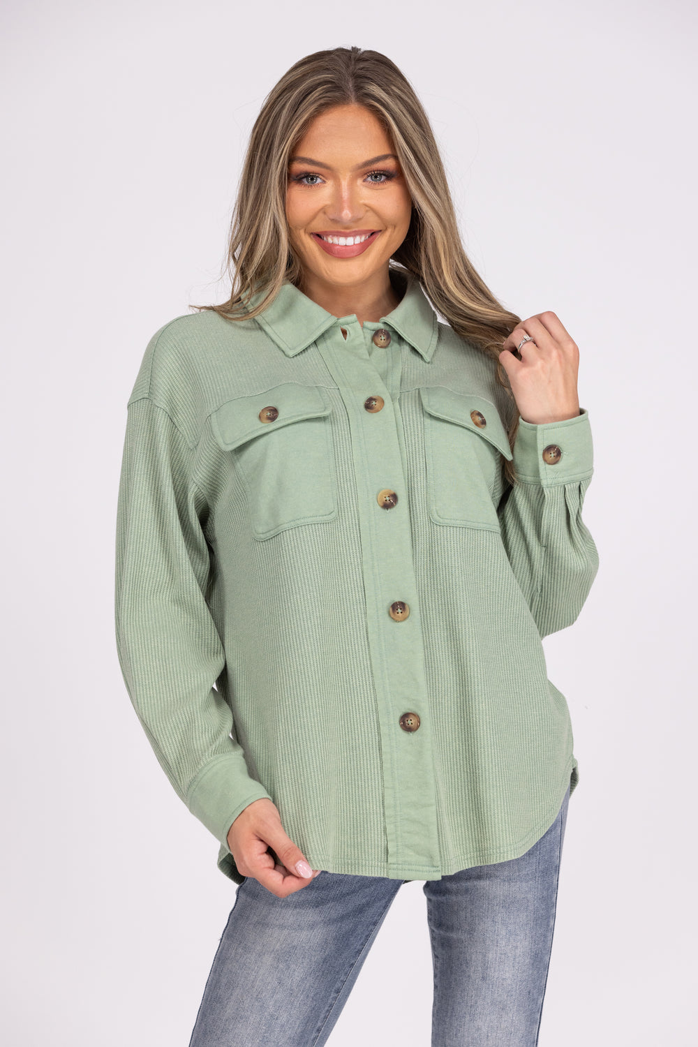 The Focus On The Good Shacket by Oddi brings your favorite winter shacket to summer with a wonderful lightweight version! This long sleeve shacket features a collared neckline, full front button down, two chest pockets, long cuffed sleeves, and a round hemline. The waffle fabric is soft, but light enough for a cool summer night! Wear this shacket over your favorite crop top!