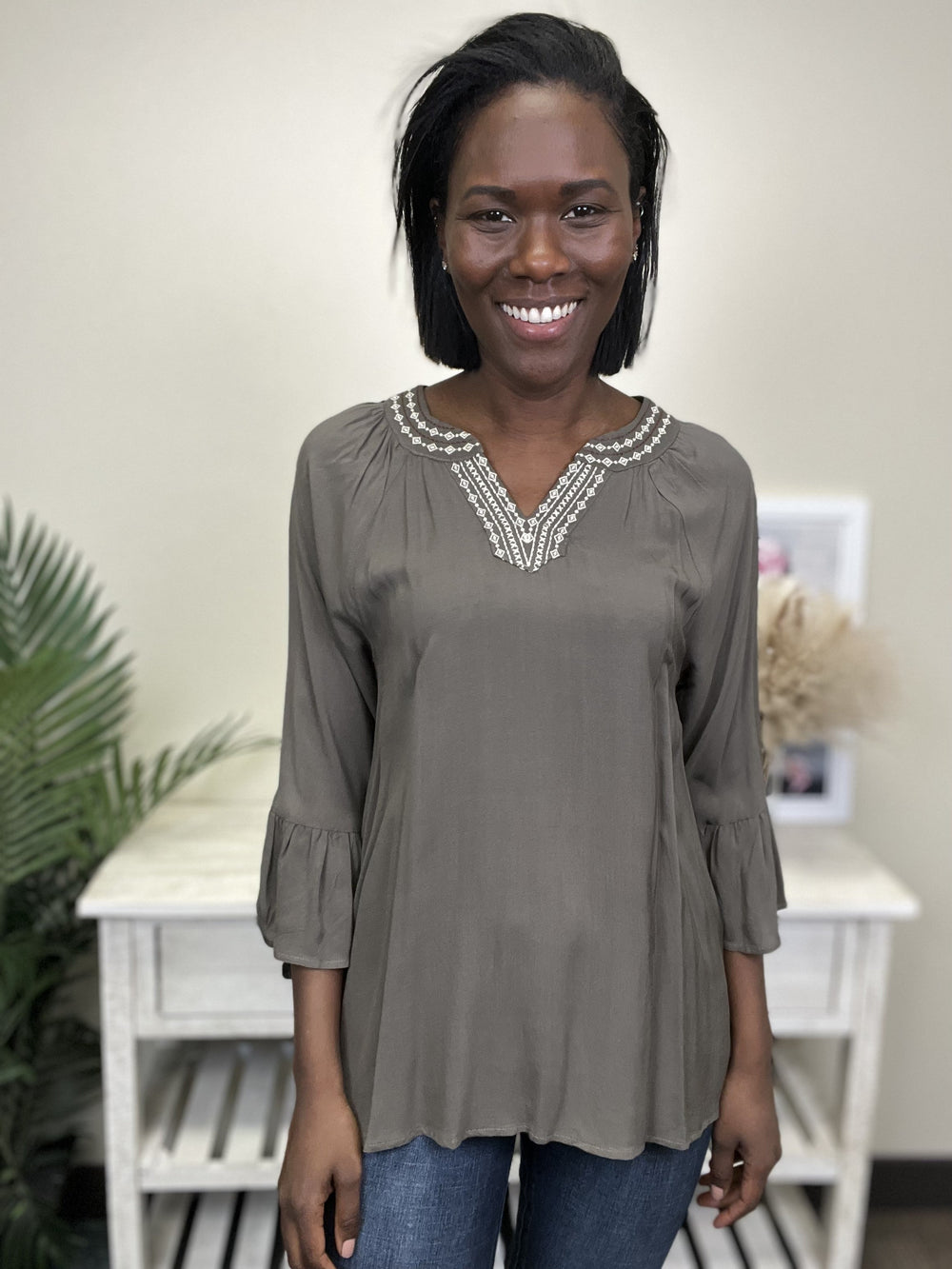 The For The First Time Top by Hayden has the boho vibe we have all been looking for! This 3/4 sleeve top has a round neckline with a V-cut, flared sleeve cuffs, round hemline, and gorgeous embroidery on the neckline. Pair this top with legging and a pair for sandals for a comfy causal look!