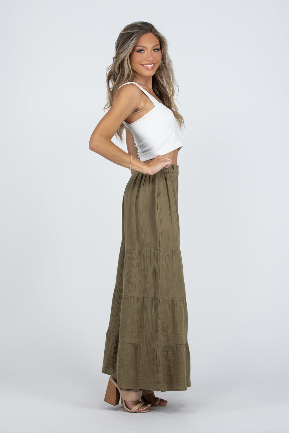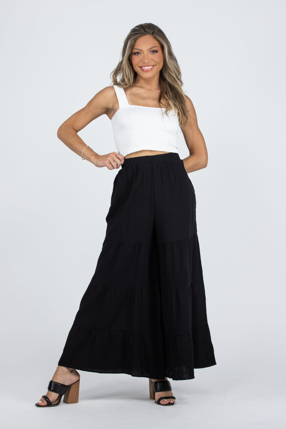 The free Fallin Gaucho Pants by White Birch are a fun way to spice up an outfit! These long gaucho pants offer tiered 8" bands of ruffles all the way down starting at the rise , tapered wide legs elastic waist band finished hem. Pair these adorable pants with a peasant top, booties and a crop denim jacket!