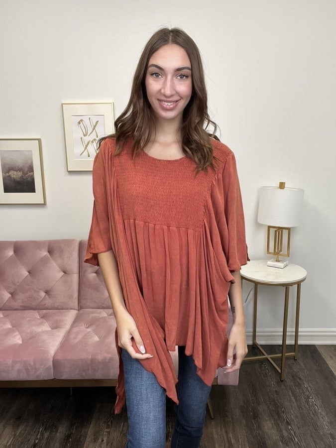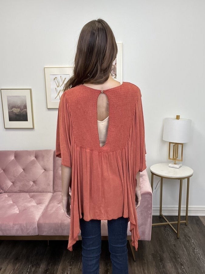 The Free Flowing Smock Top will have you wanting to slow down, turn on some music kick off your shoes and dance. The Free Flowing Smock Top by Oli & Hali is a square cut design smock top with a waterfall hemline, eyelet slits on the sleeves and keyhole button closure back. The Free Flowing Smock Top won't hold back any movement or inspiration to move and flow freely.