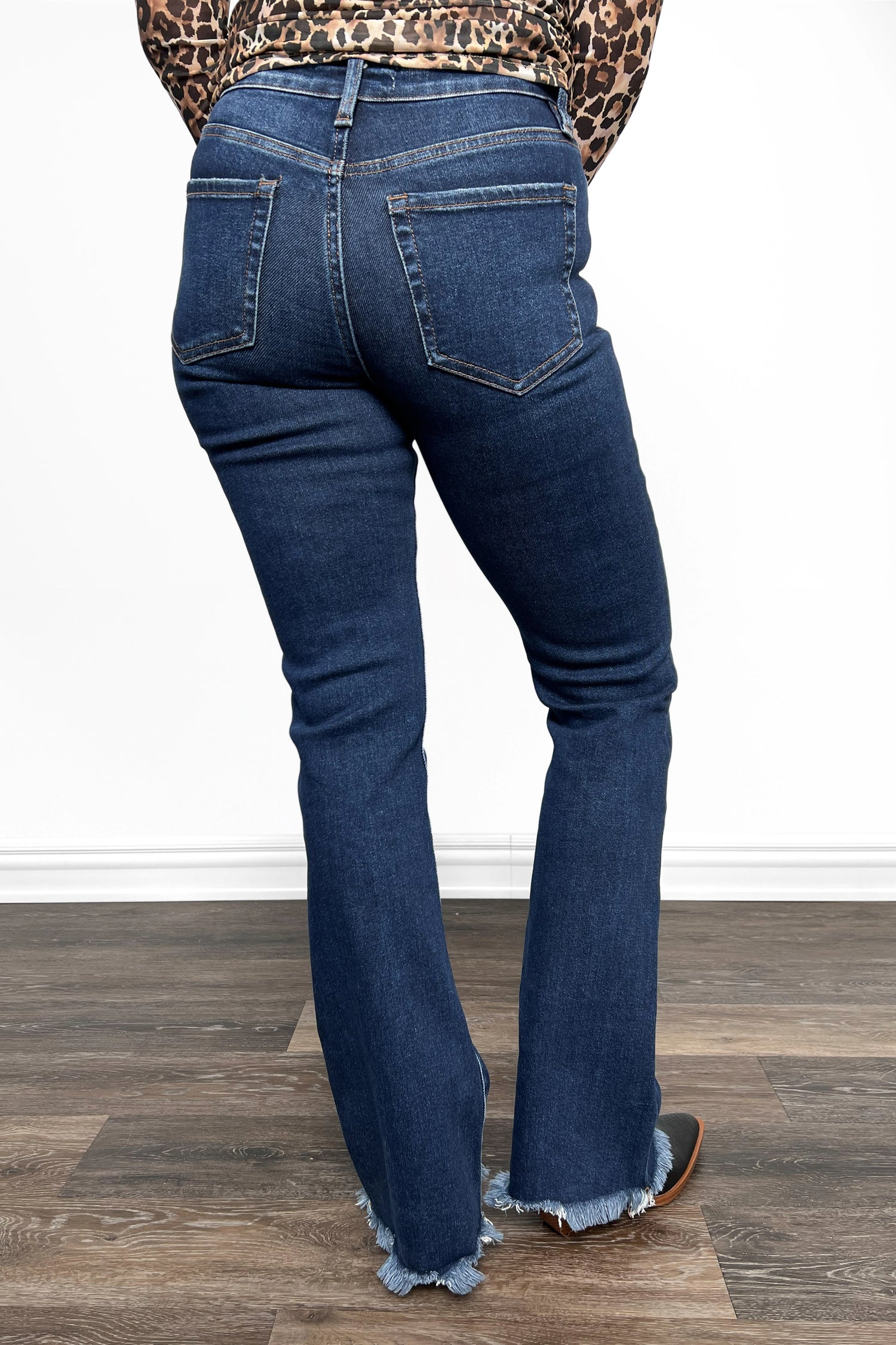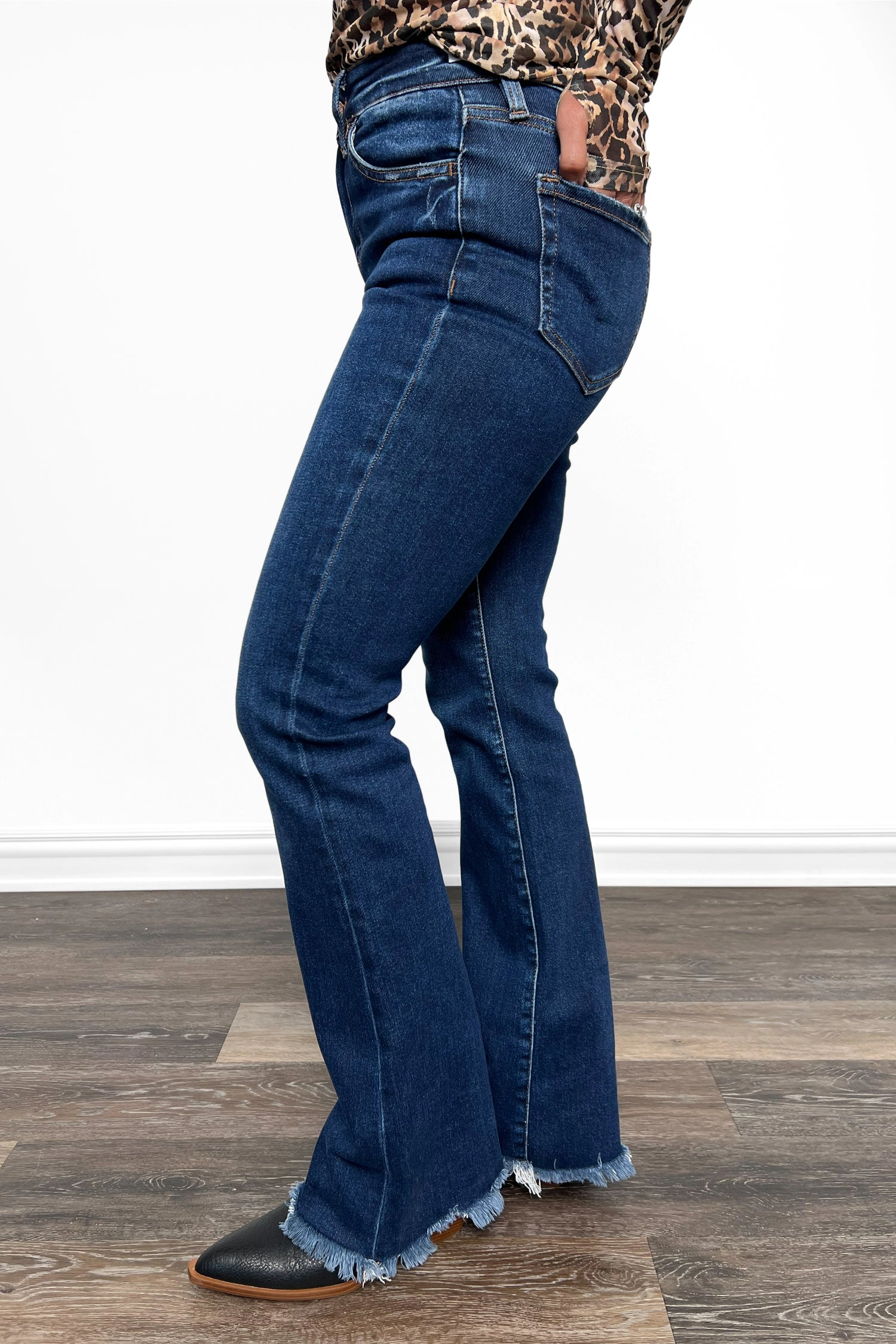 - Bootcut: Fitted silhouette through the thighs and knees, flaring out slightly from the knee to the hem.
