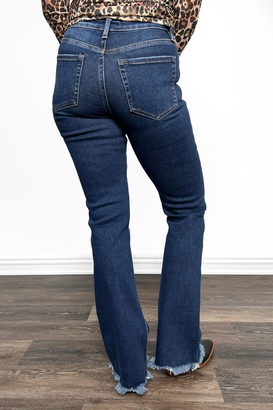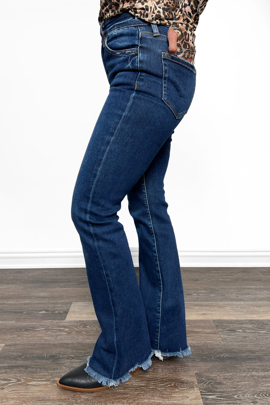 • Bootcut: Fitted silhouette through the thighs and knees, flaring out slightly from the knee to the hem.