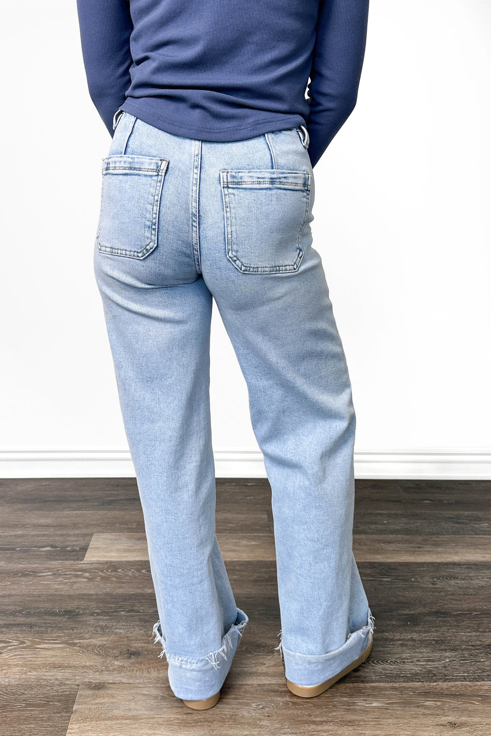 - Distressing Details: Light wash that's non-distressed with a washed-out look.