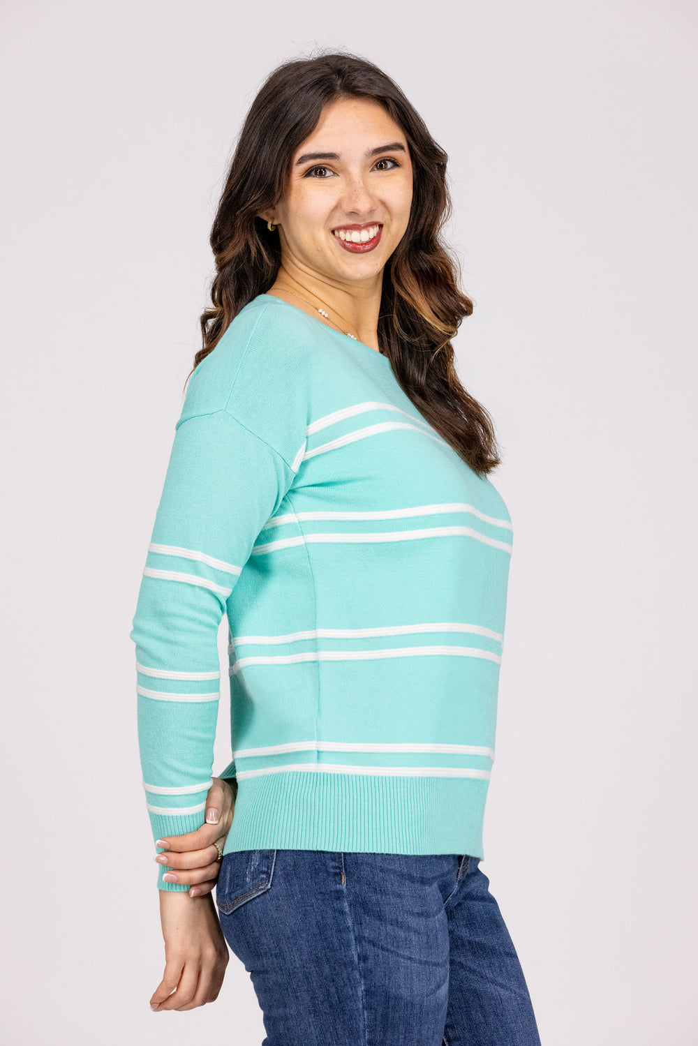 Stay stylish with our Fun and Fresh Style Sweater! Featuring textured stripes and a boat neck, this pullover is perfect for any occasion. Plus, the ribbed hem and cuffs add a touch of sophistication. Get ready to turn heads in this quirky and fun sweater!