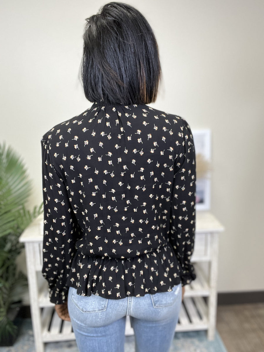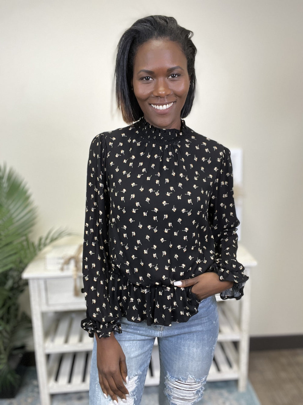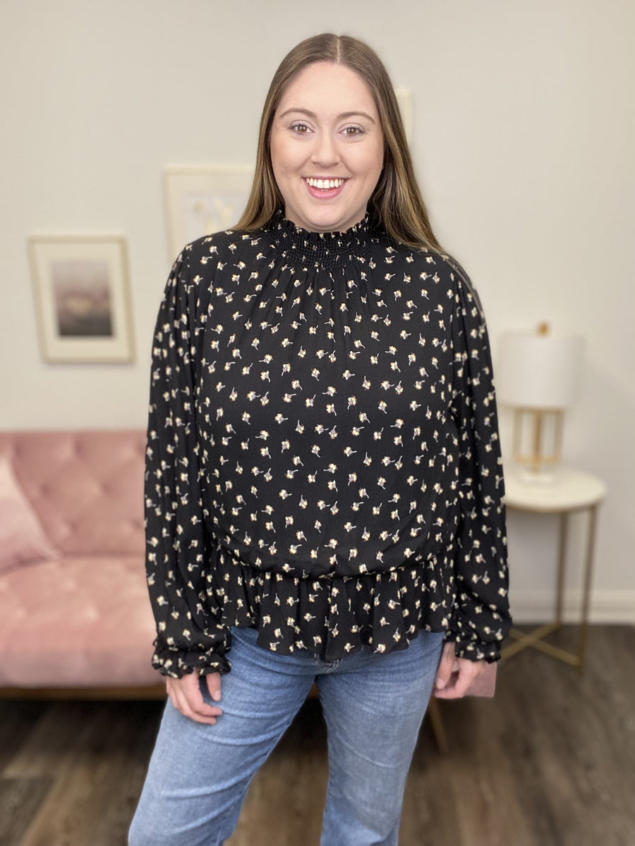 The Fun Floral Top by White Birch is a flowy top with an elastic peplum detail. It features a high low hemline, puff sleeves with elastic ruffle and a mock neck with smocking detail. This top pairs perfectly with your favorite pair of high-rise denim for an effortless look for day or night!!