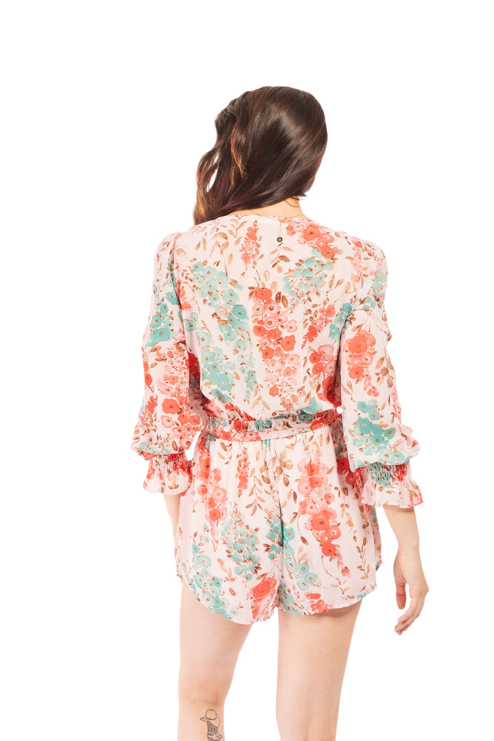 The Garden Dreams Romper by Kori is a beautiful floral printed soft chiffon romper. It features long sleeves with smocked detail, V neckline with button front, side pockets and elastic waist with self tie! This romper is beautiful and is perfect for any occasion!