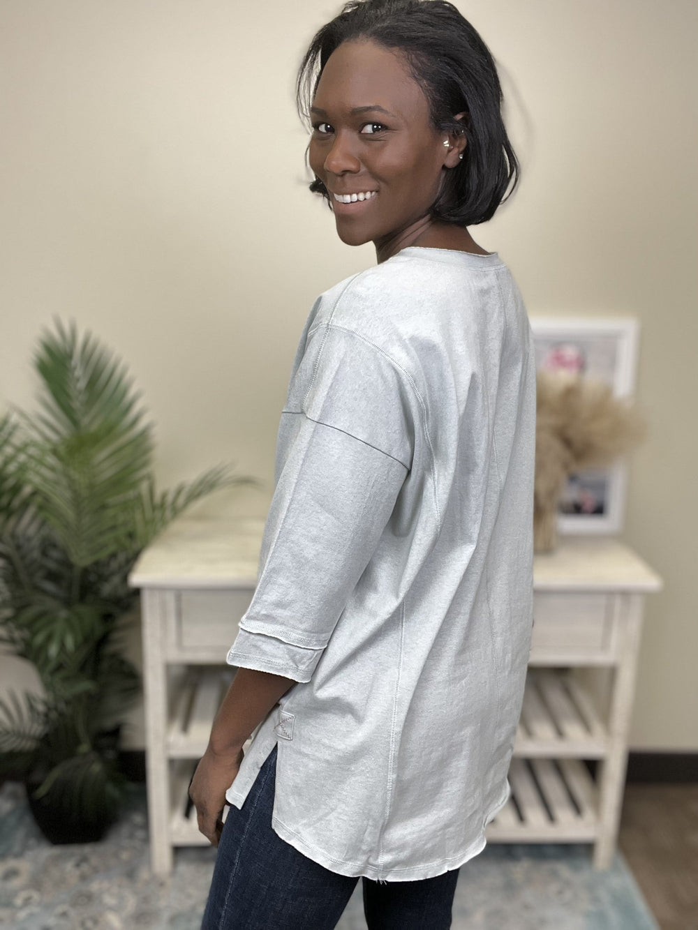 Get Excited Top by Easel is a half sleeve top with a rounded neckline with slight front dip, exposed stitching accents, and rough cut edges. The bottom of the top features a hi-lo hemline and flattering side slits. This is the perfect lounging top to match with your favorite pair of leggings.