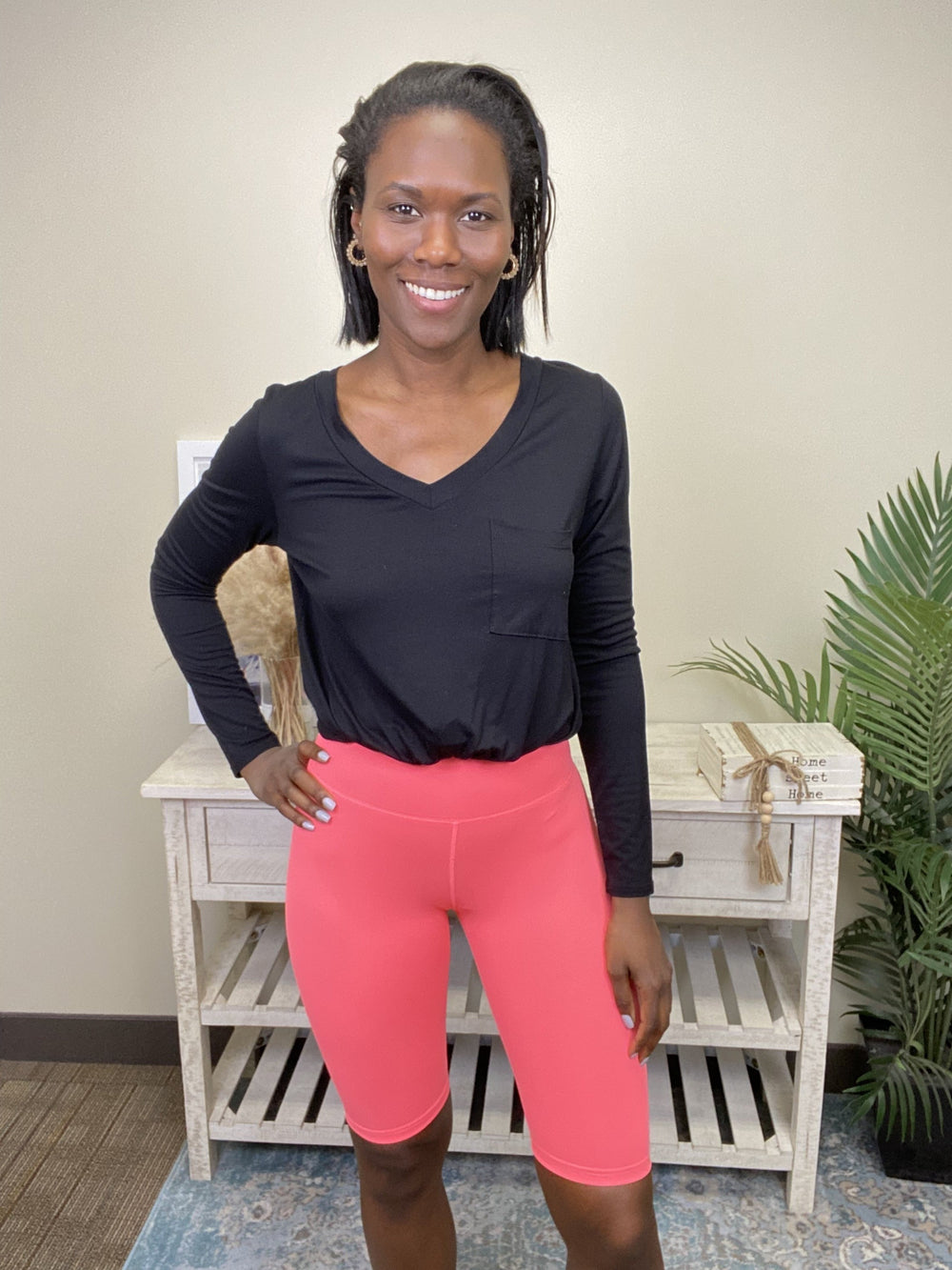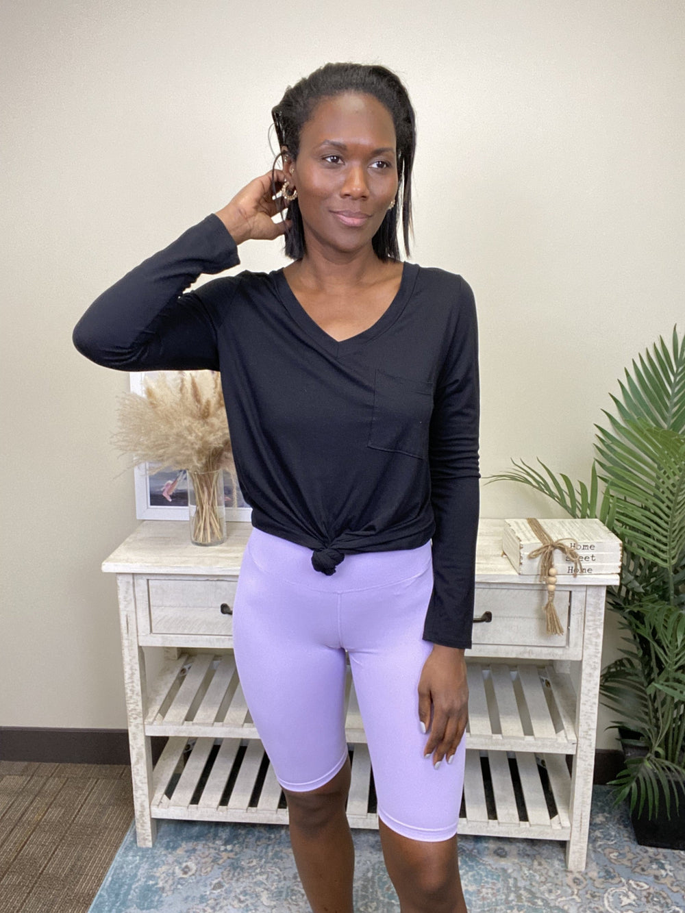 The Get It In Gear Biker Shorts by White Birch are the biker shorts of your dreams. These high-waisted solid knit biker shorts feature a wide yoga waistband and a straight hem. These biker shorts are perfect for everyday wear or for a day at the gym!