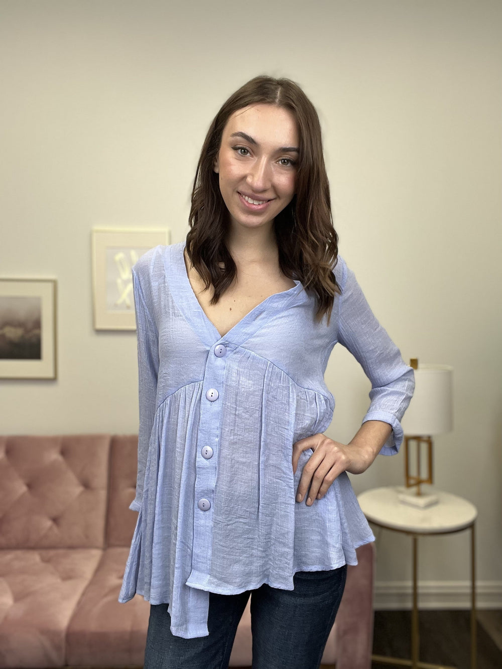 The Girly Vibes Top by Miley & Molly is a feminine top with rolled long sleeves with a button down v neck front. It has a lightweight linen feel to it. This top is perfect for sitting or walking on the beach!