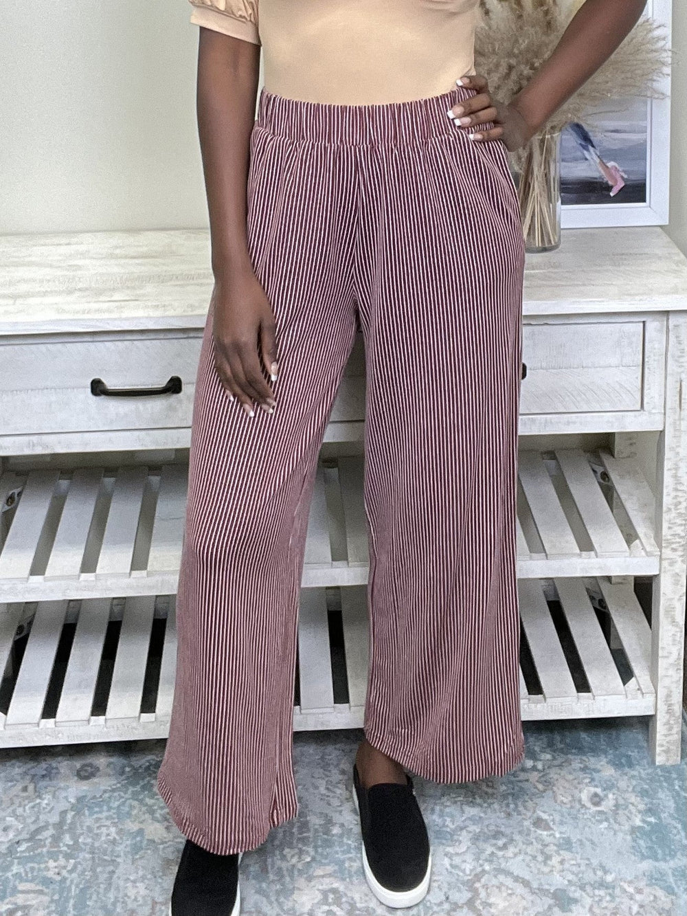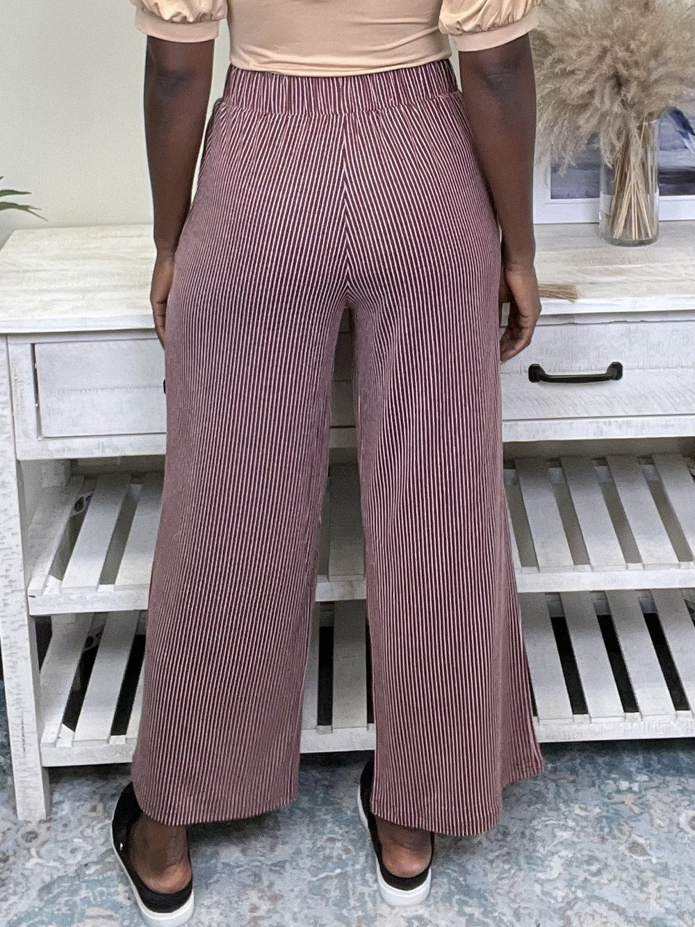 The give Me Space Wide Leg Pant By Gigio is a perfect statement piece to add to your fall wardrobe! These pants feature a 2" knit waist band that sits at the navel for comfort, 6" side slit pockets are always a bonus when it comes to loose fitting pants! This gorgeous fabric has a textured white stripe pattern that flows nicely with movement. They can be worn in a variety of ways starting with a button down shirt and heels or crop sweater, top it off with a jacket or poncho and you are ready for any occasion!