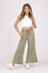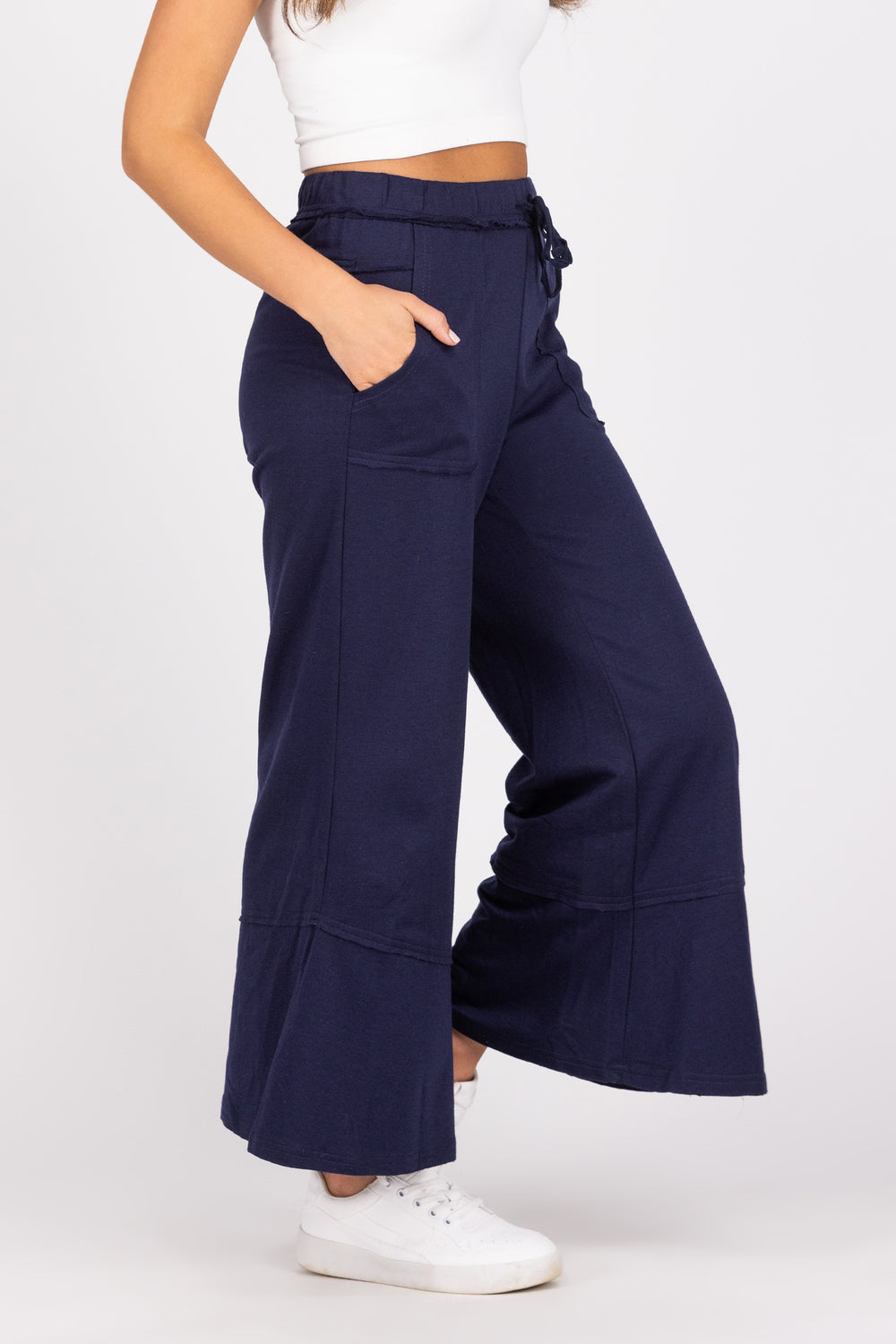 The Give Your All Pants By Jodifl is a solid pair of pants. These pants feature side pockets, drawstring waistline, rough cut details and wide flared legs.