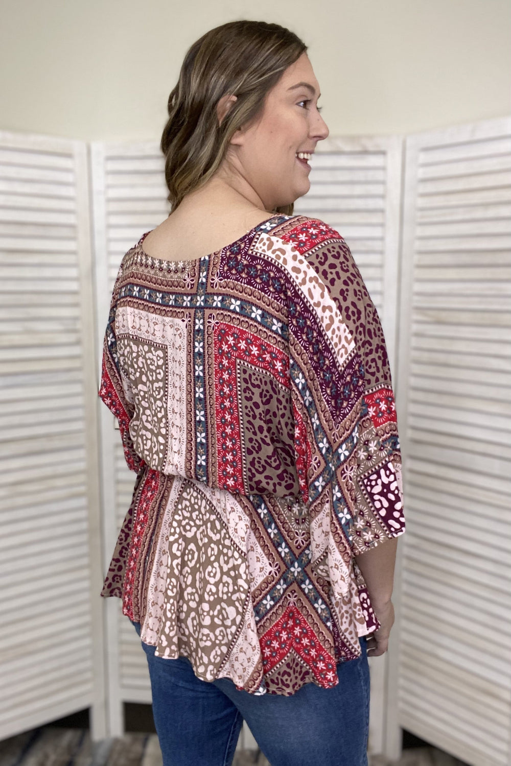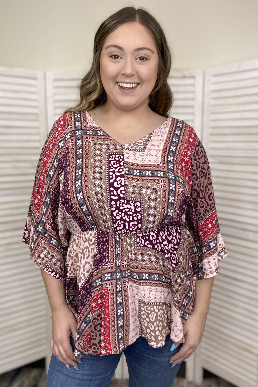 The Go All Night Top From Andree By Unit is a printed patchwork top with surplice bodice and elastic on the waistline. It features a V neckline with kimono sleeves. We love the fit on this top and the mixed patchwork of animal prints and other patterns make this top perfection!