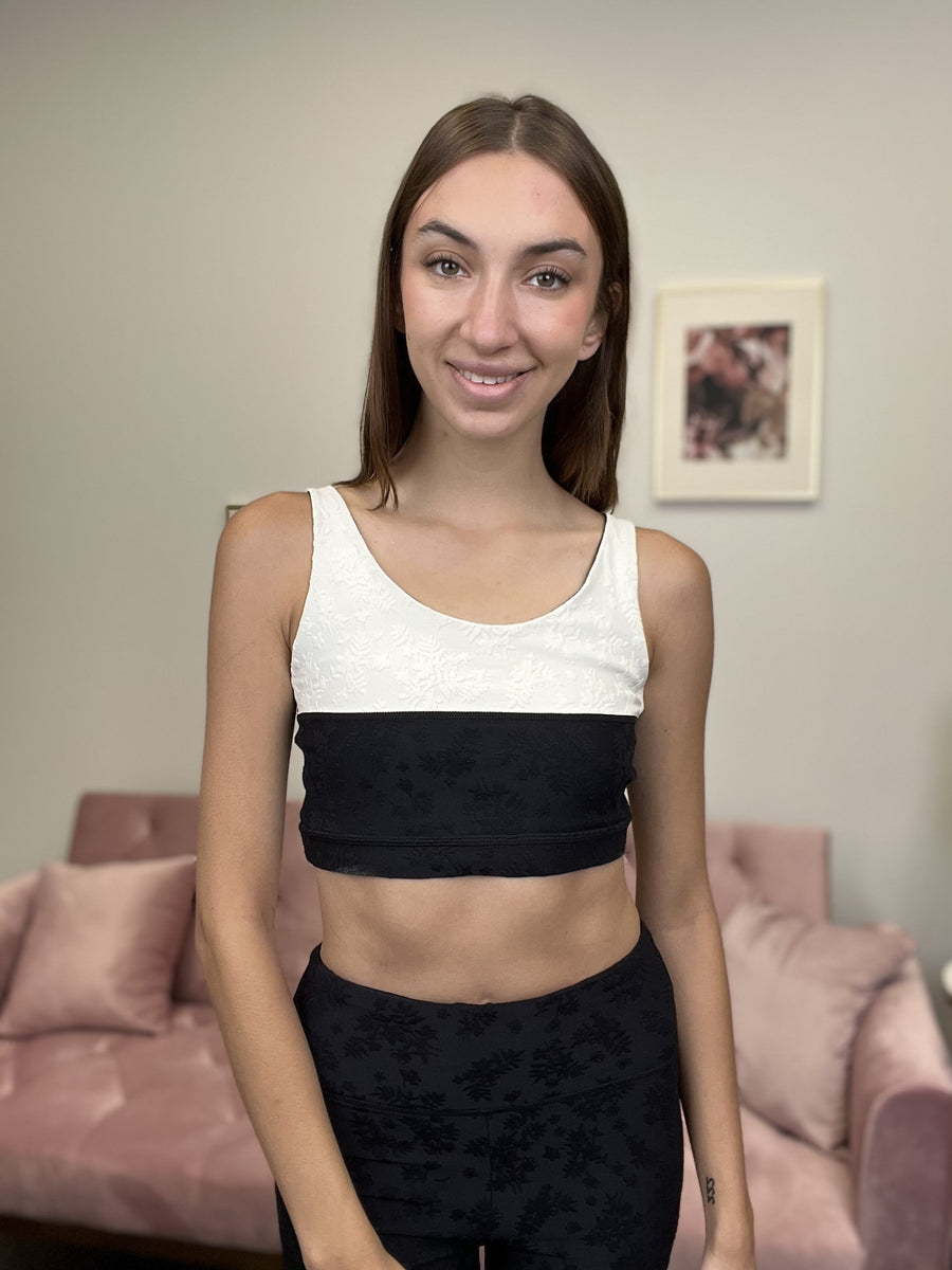 The Half and Half Sports Bra by Mono B is an updated version of the original half and half by using the best-selling TACTEL fabric with a raised flower texture. All the favorite features (the unique split look, the adjustable straps) remain the same. This bra has removable bra pads, is double-layered, moisture-wicking, and has four-way stretch. Make this bra essential to your workout routine!