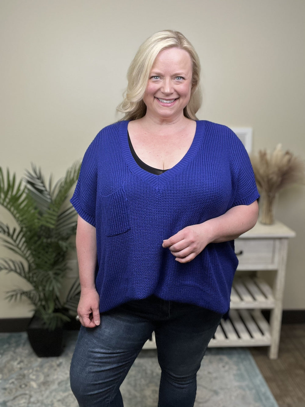 The Halfway There Top by Jodifl will be your new favorite sweater top! It features a V-neckline, dolman style sleeves, one chest pocket, straight hemline and flattering side slits. This Top will pair perfect with your favorite white denim and bralette or tank for spring!