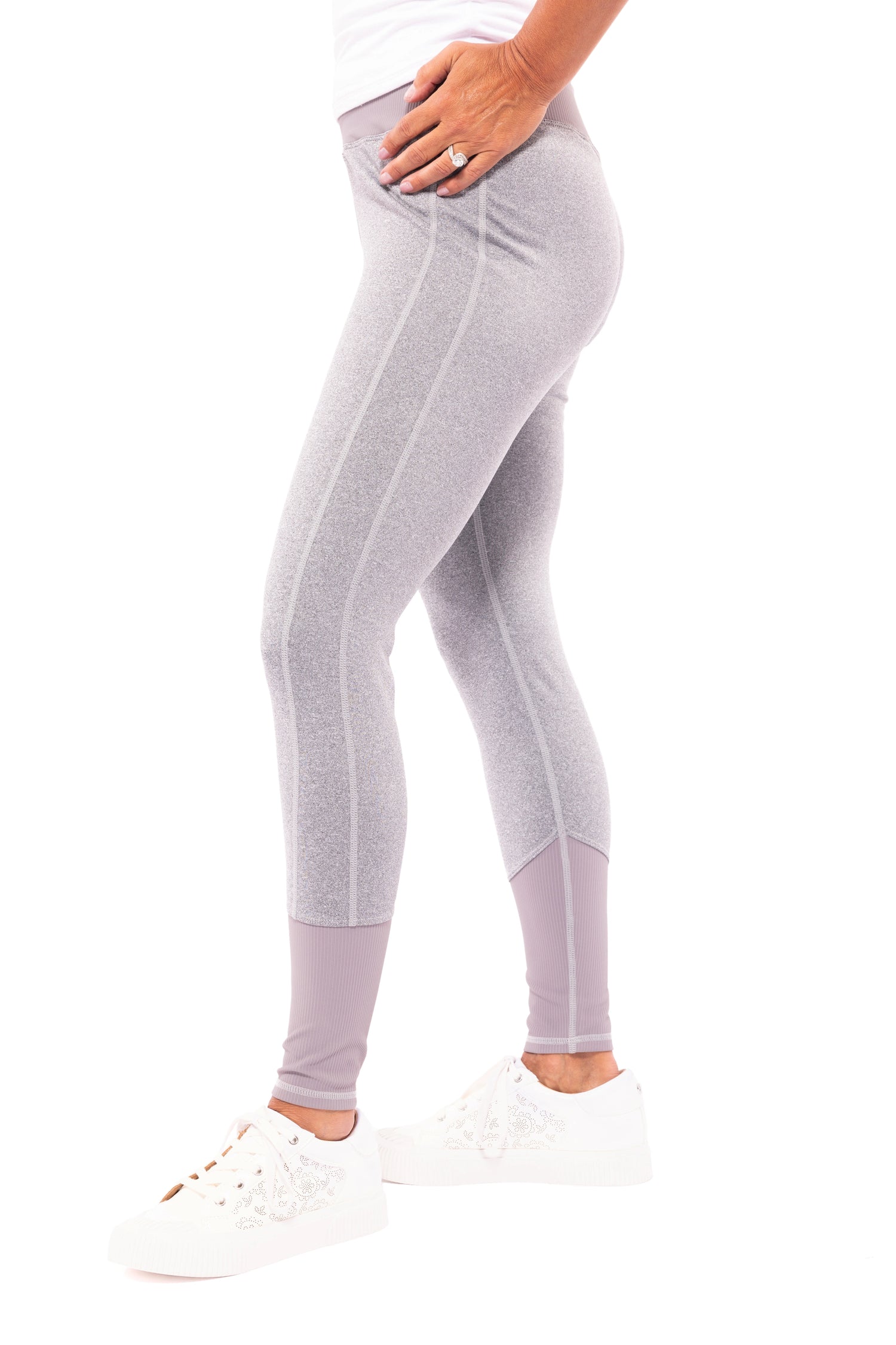 The Happier Than Ever Leggings By White Birch is a high-waisted solid knit legging with a wide yoga waistband featuring a contrast solid diagonal inset. The fabric is a combination of a yoga knit and a ribbed knit.