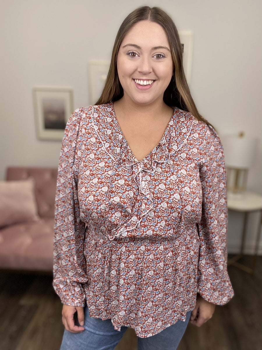 The Heartbreaker Ruffle Top by GiGio has the right amount of ruffle in all the right places! This top has a delicate floral print with a slight puff at the shoulder, V-neck trimmed in ruffles with a little tie front closure and a 10" ruffle from the gathered waist to the finished hem. Pairs well with pants or trousers for a great office look! Pull on a denim skirt and boots and you're ready for the weekend!