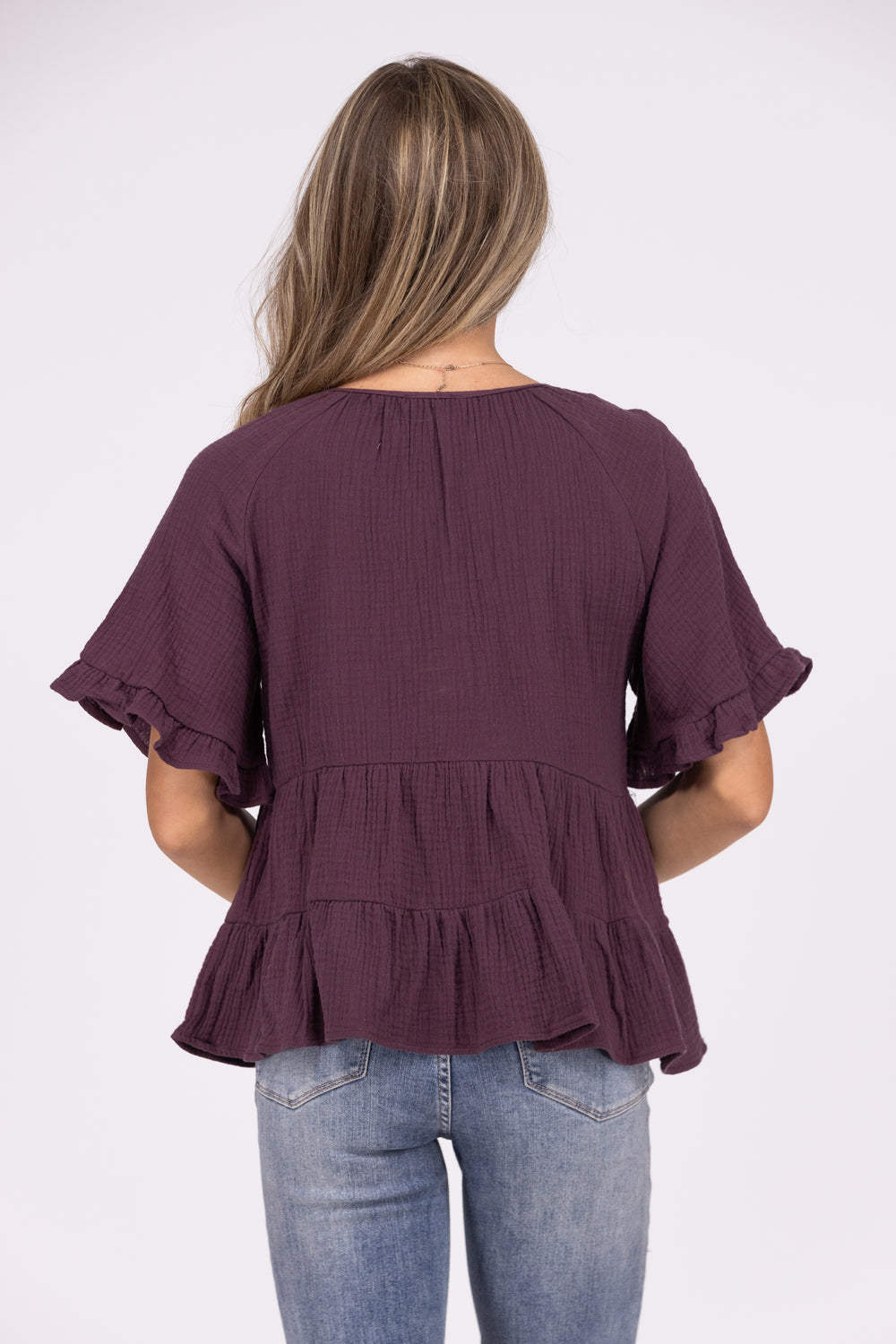 The Help But Notice Top will have you being noticed every time you wear it. This woven gauze top features a tiered ruffle hem, a round neckline with a V split, and raglan style sleeves with a ruffle detail. The Help But Notice Top is perfect for a day at the office, dressed up for a girls night or paired with your favorite denim for a casual day of running errands.
