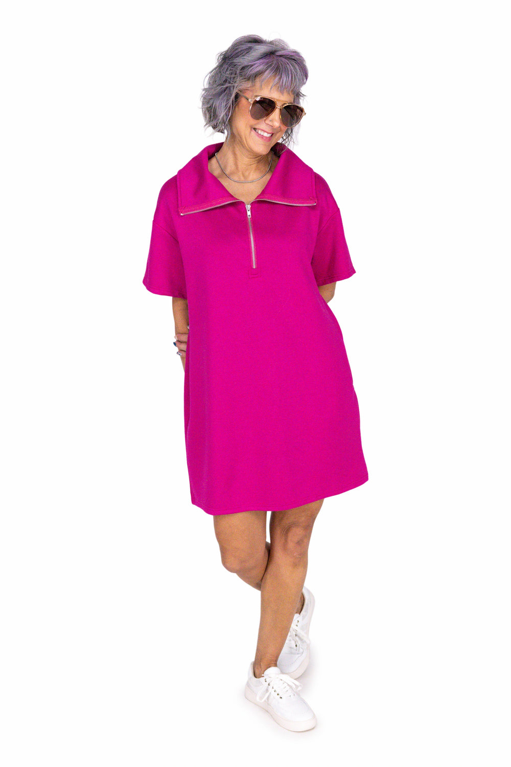 Introducing the "Here And Now" Women's Short Sleeve Solid Knit Dress by White Birch – combining style and comfort with a loose fit, zippered open neck, and convenient side pockets. You can dress this up or wear everyday - this dress will have you looking and feeling great in the here and now!