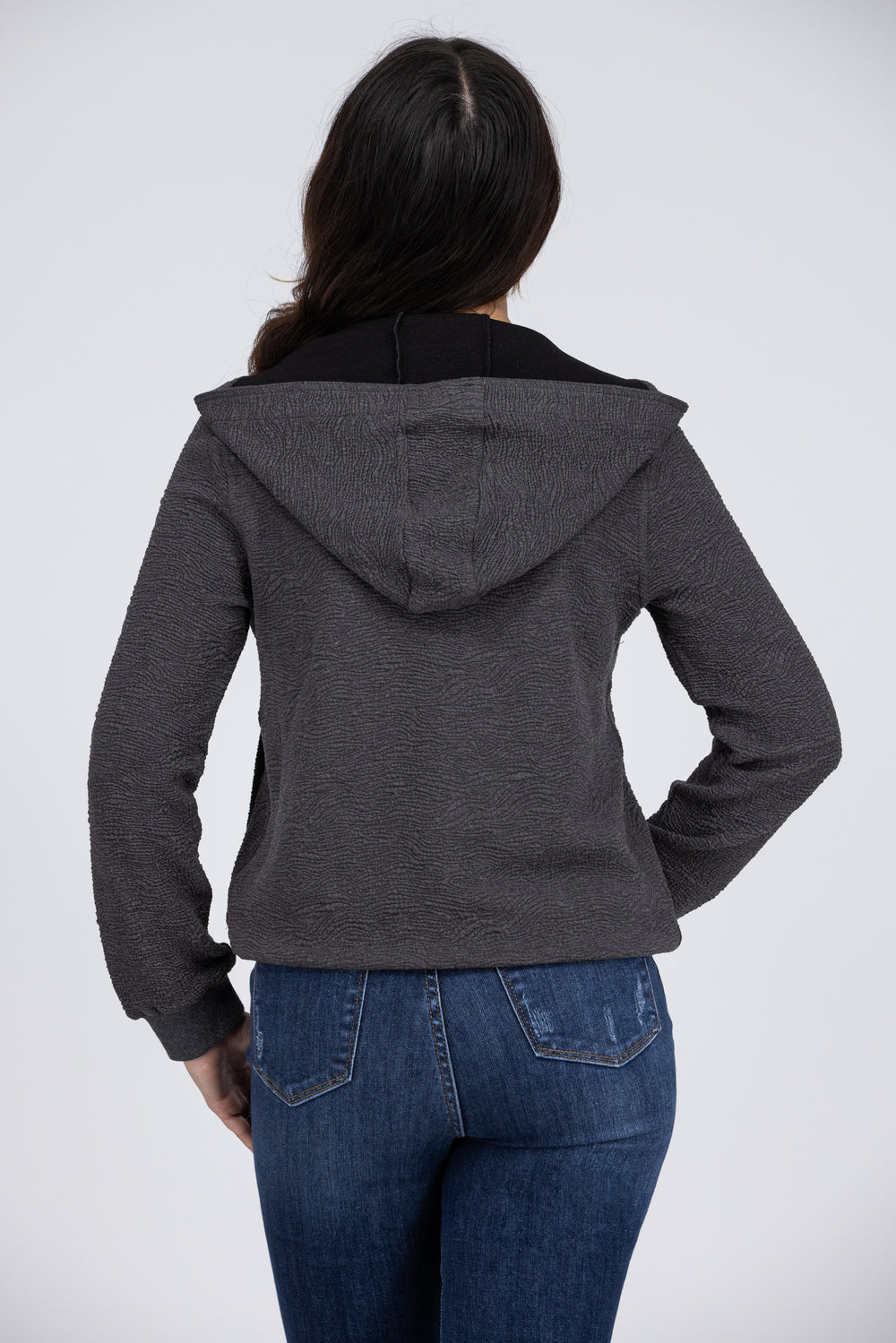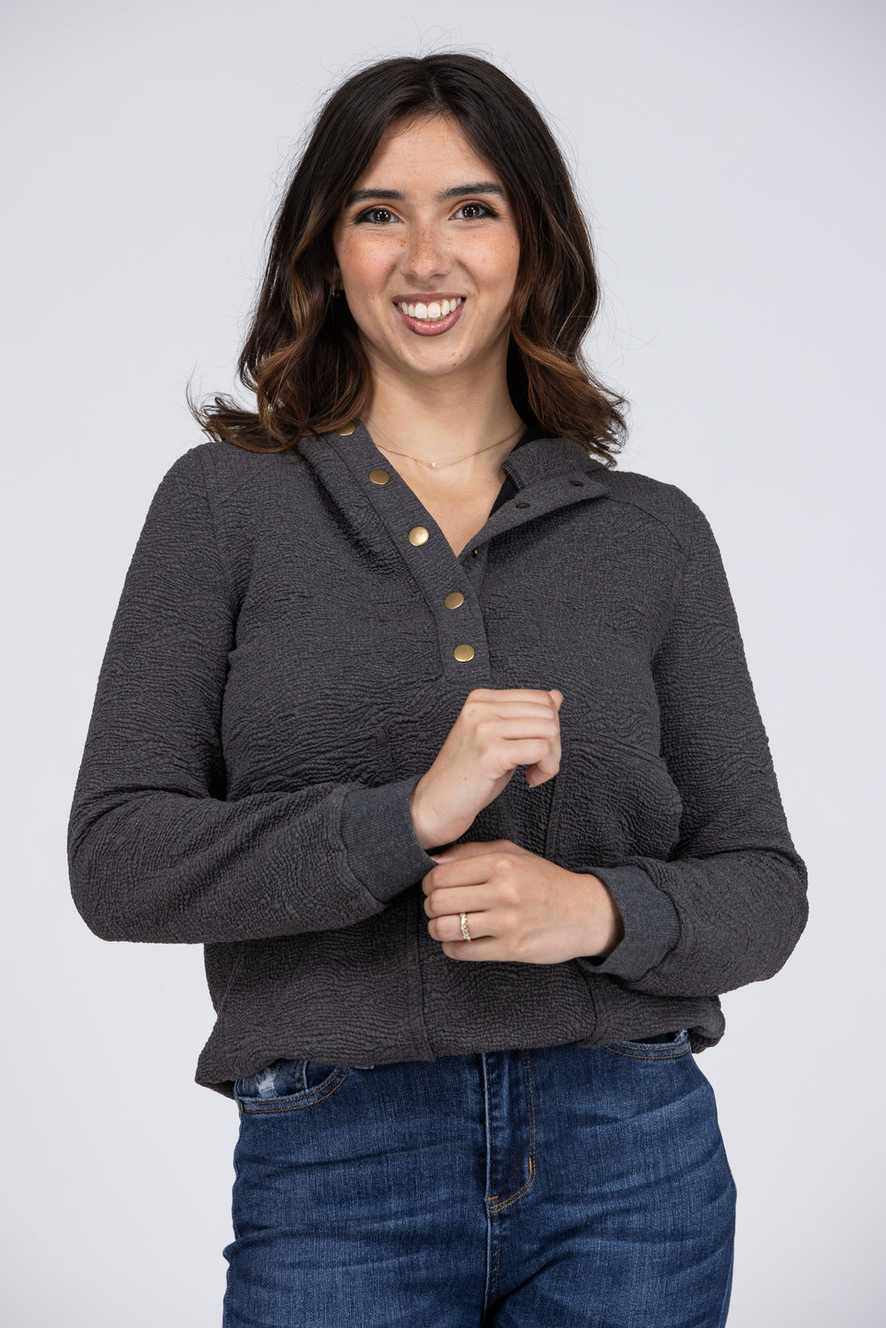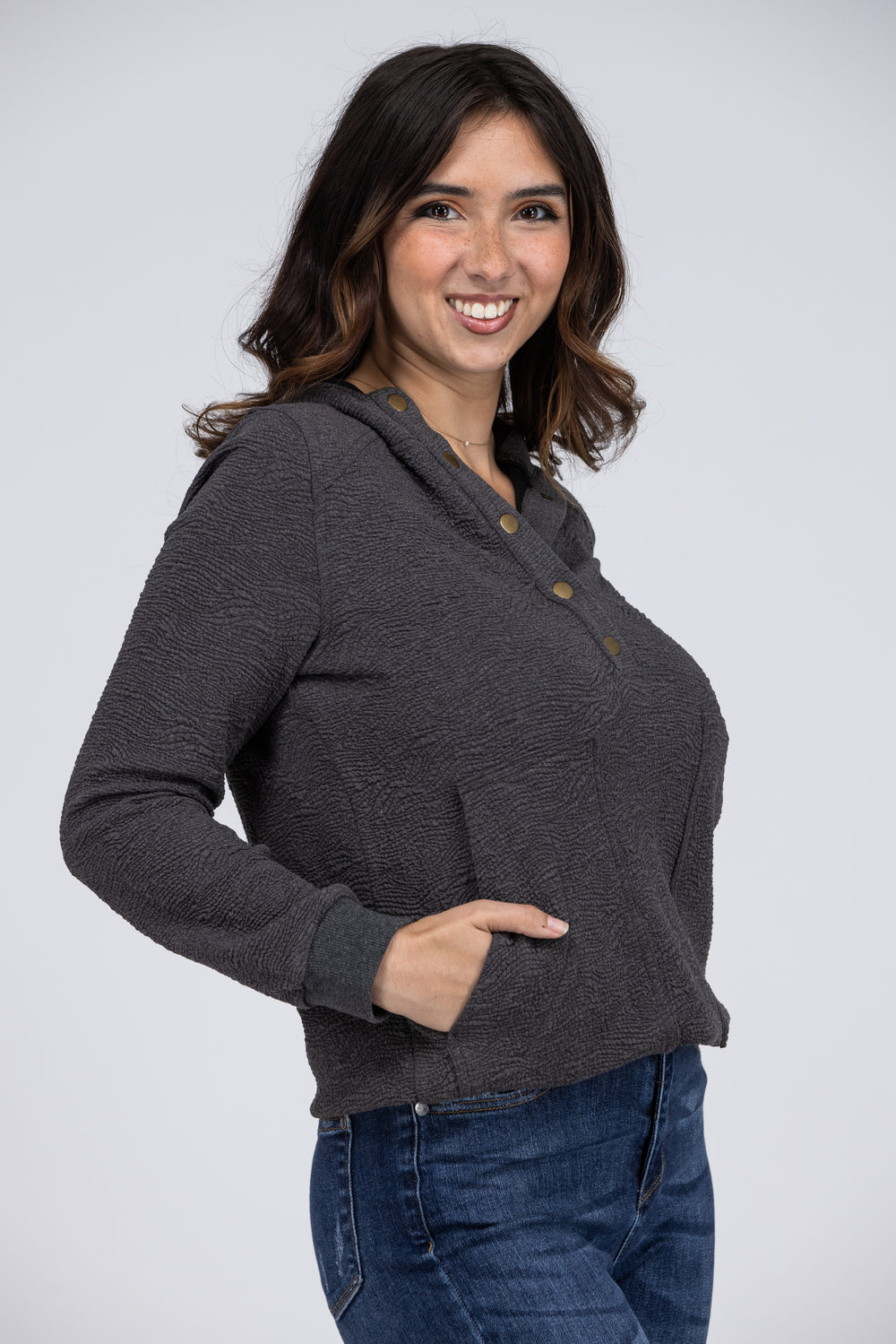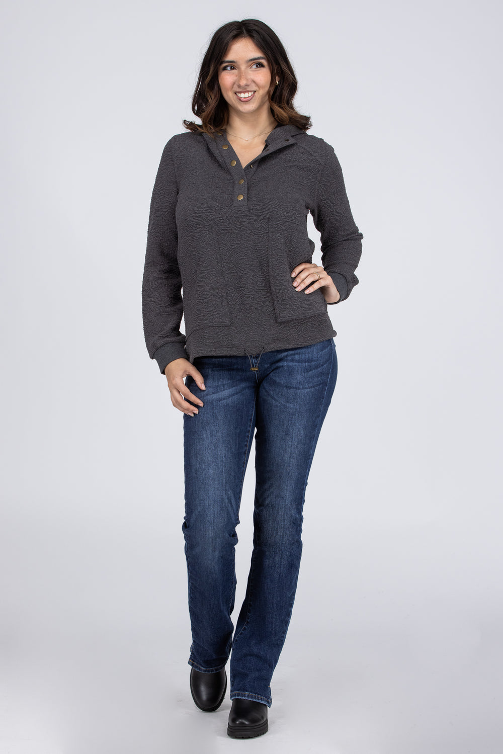 The Here and There Top by Doe & Rae is the top you wear when you have to do a lot of going here and there! It features a hooded neckline , half button down front, long sleeves with ribbed cuffs, two front pockets, and a straight hemline with adjustable drawstring. You will love the texture of the fabric! It adds an extra touch!