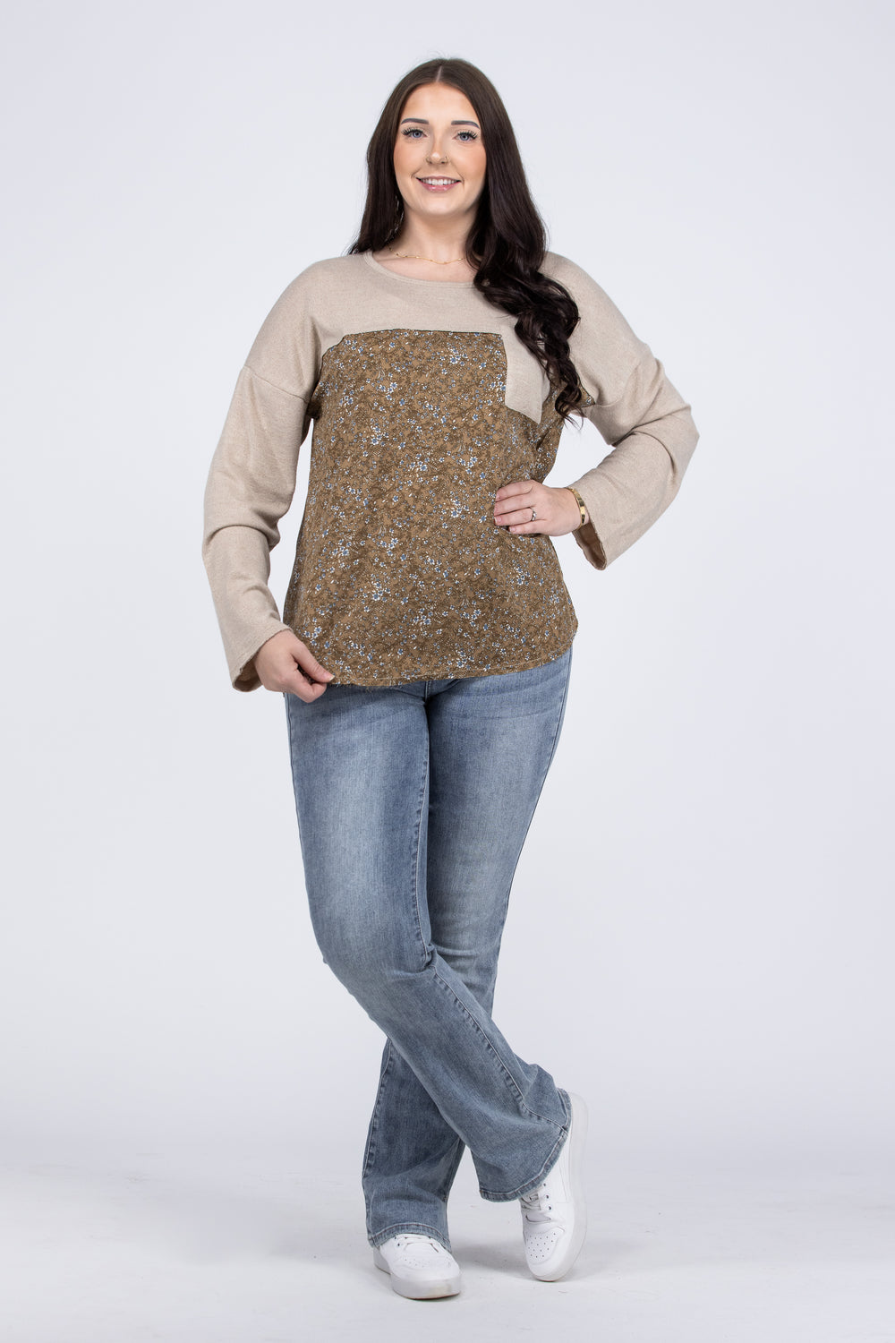 The Hey There Top by GigGio is a slub knit and floral print woven top, featuring long sleeves, a rounded neckline, a chest pocket, dolman sleeves, and a rounded hem with some rough edging, Oversized yet light weight, the Hey There Top is perfect for leggings and denim.