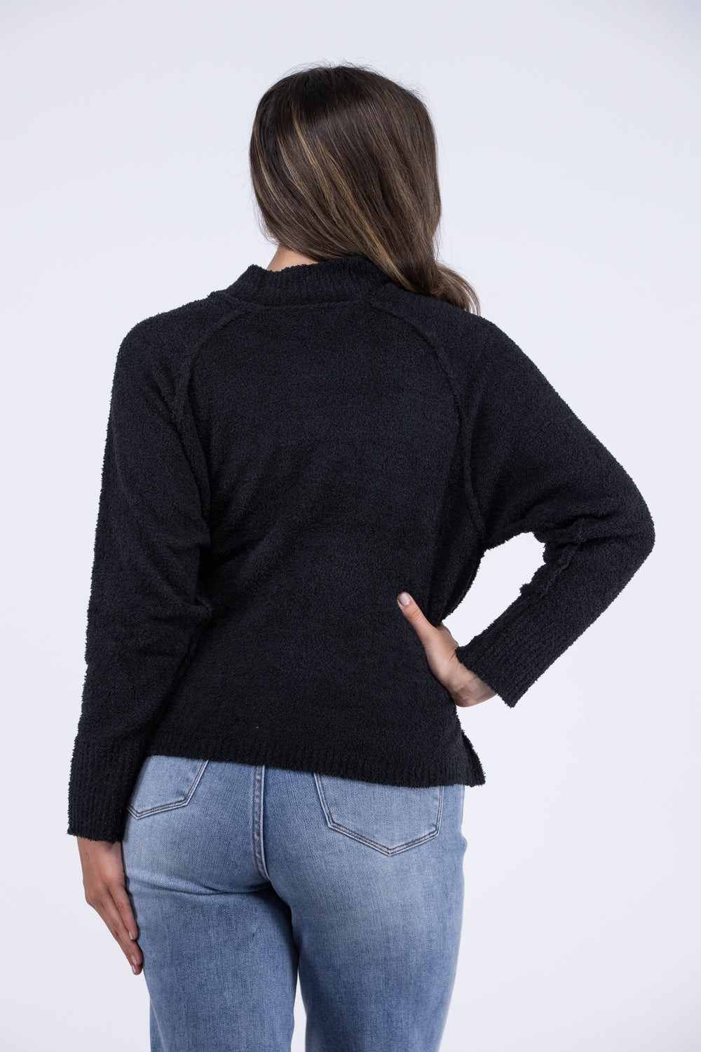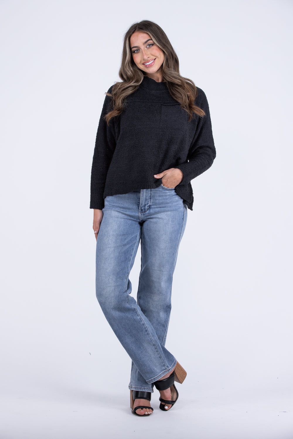 The High Up Top By Easel is a brushed thread knitted sweater. It features long sleeves, mock neckline, ribbed neck cuffs and hem, and a ultra soft berber fleece fabric. It offers a cropped length with a relaxed and slouchy fit and a chest patch pocket.