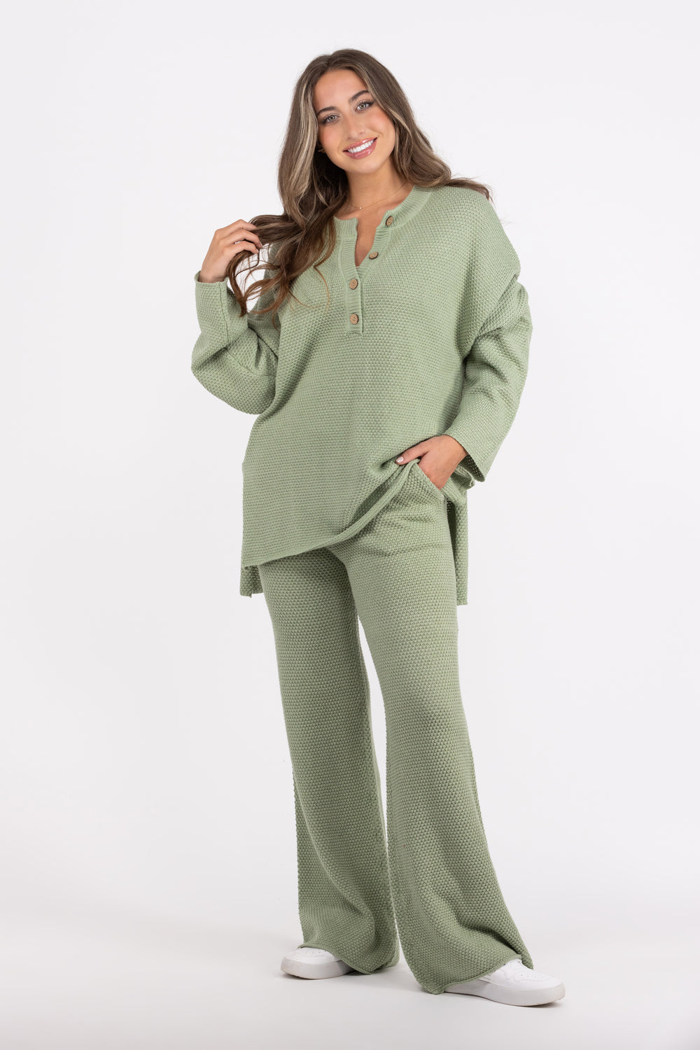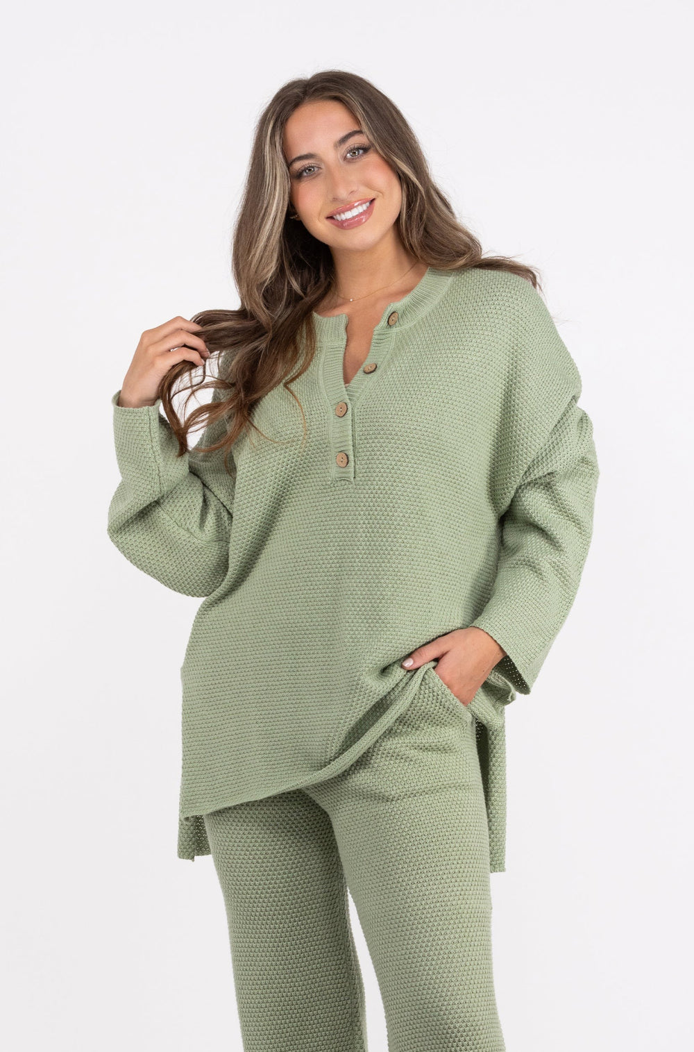 The Hugging Heartbeat Sweater by Heyson will give you all the love and warmth of a cozy Valentine's day with that special someone. It features a henley neckline with button down details, long sleeves with drop shoulders, and a hi low hemline with side slits for a flattering silhouette. The oversized and relaxed fit make this top a perfect go to when lounging around or a day for running errands. To complete the look make sure to pair with our matching "Hugging Heartbeat Sweater Pants".