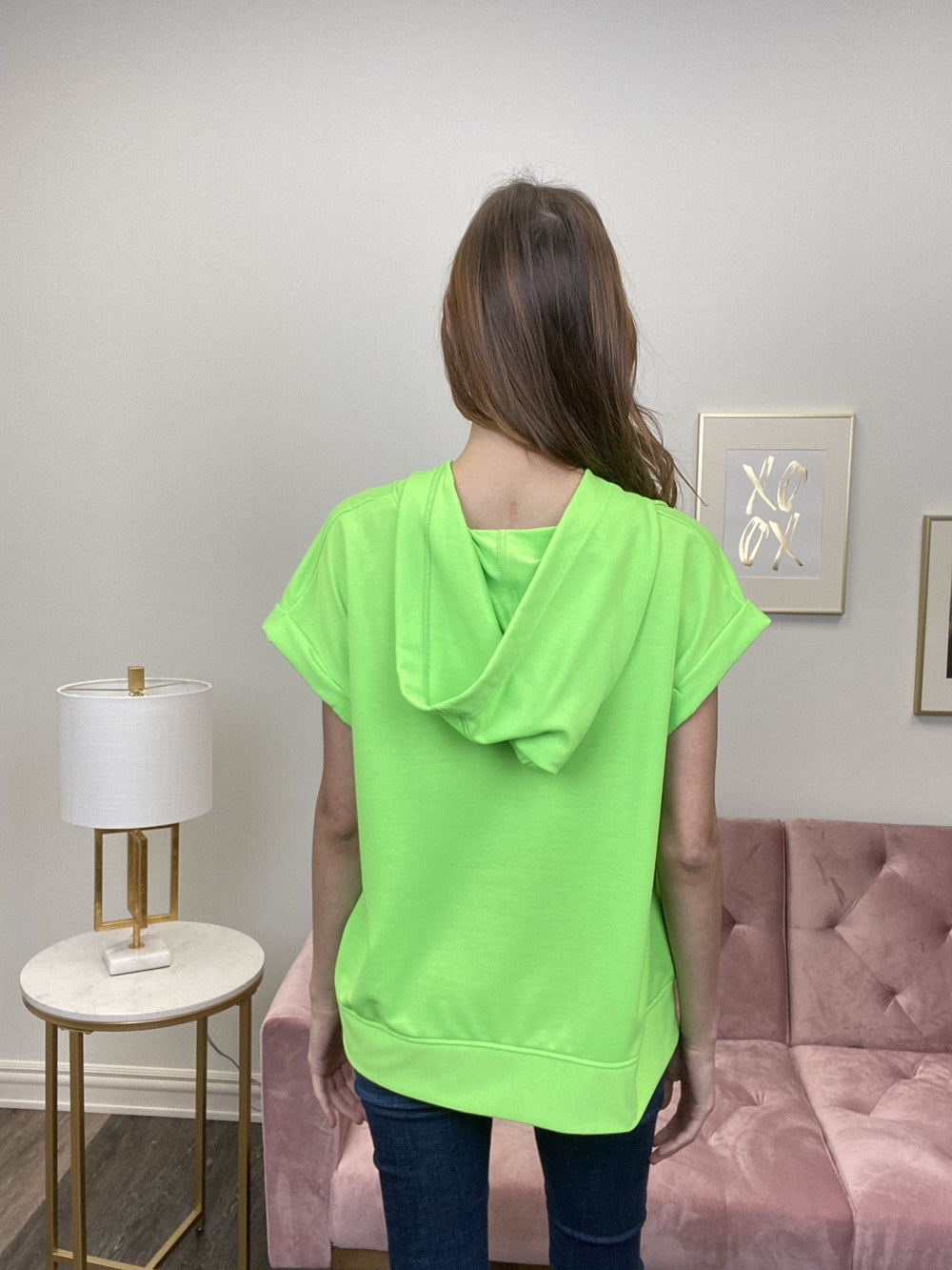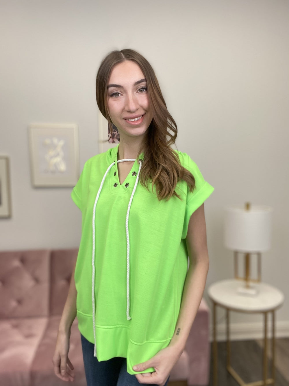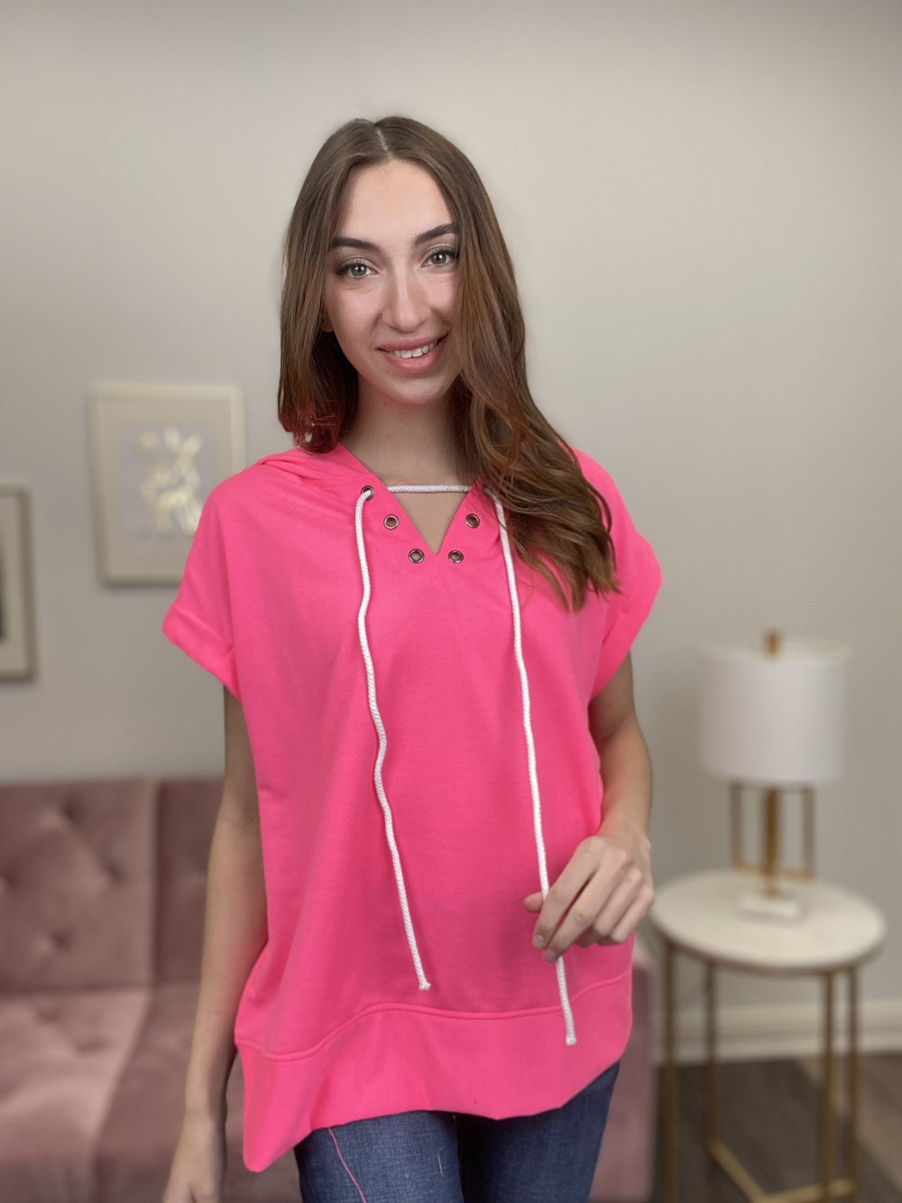 I Am Found Hoodie By Sew In Love is a solid hoodie top. It features short cuffed sleeves, thick banded hem, V Neckline with tie detail and a hood. This top is perfect for when you want your hoodie but its too nice out to wear one!