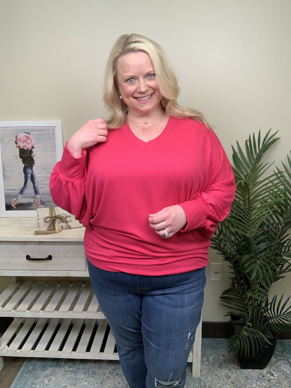 The I Believe In Heaven Top by White Birch is a long sleeve solid knit top with a V-neck featuring a tapered waist and a relaxed fit. The fabric is a lightweight ribbed knit. Feel comfy and stylish when pairing this top with your favorite denim!