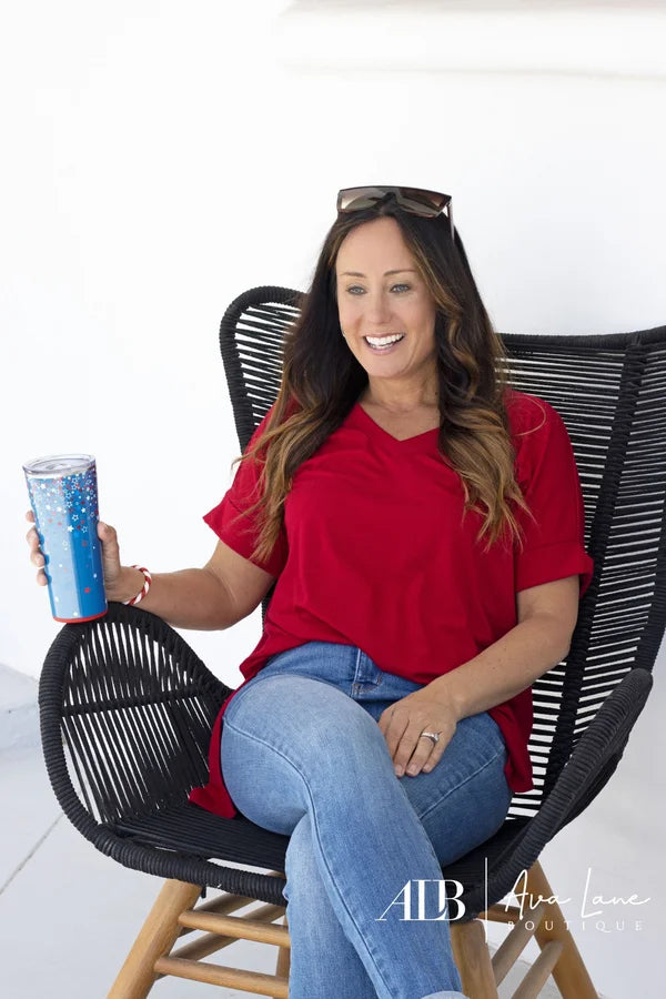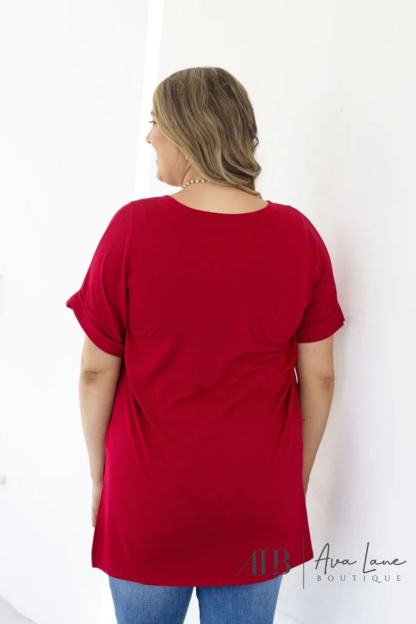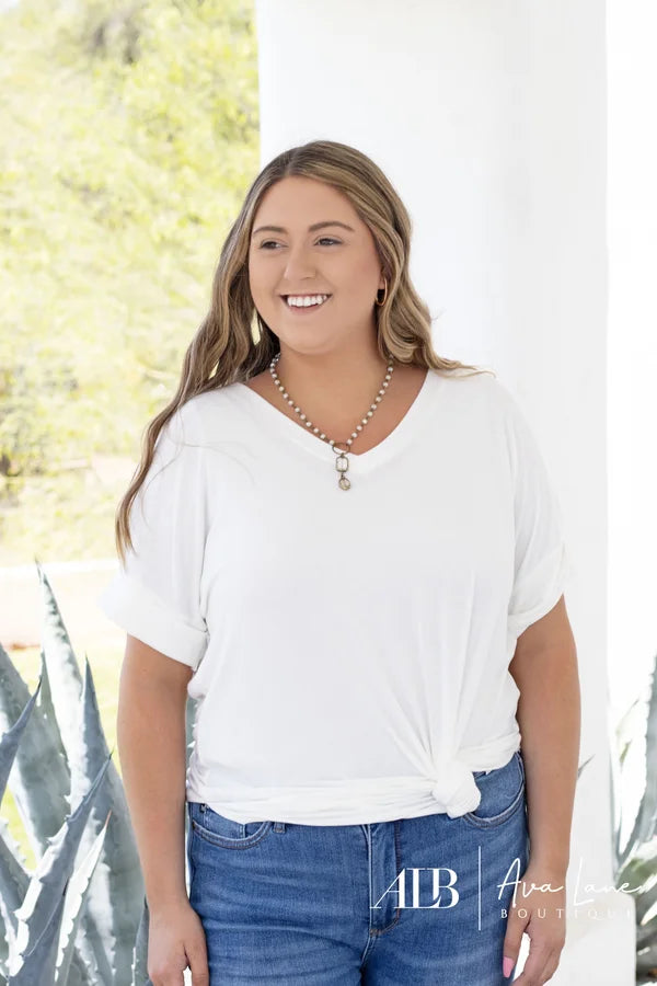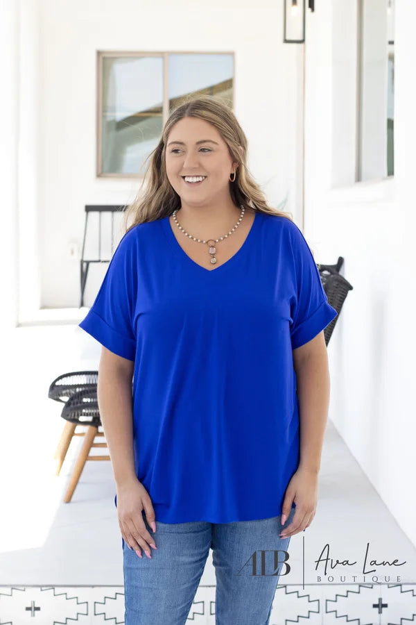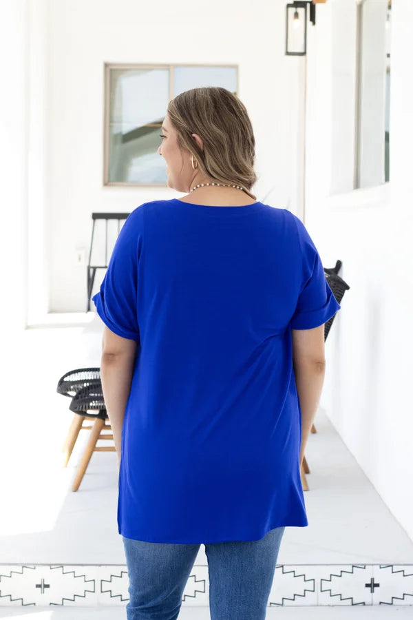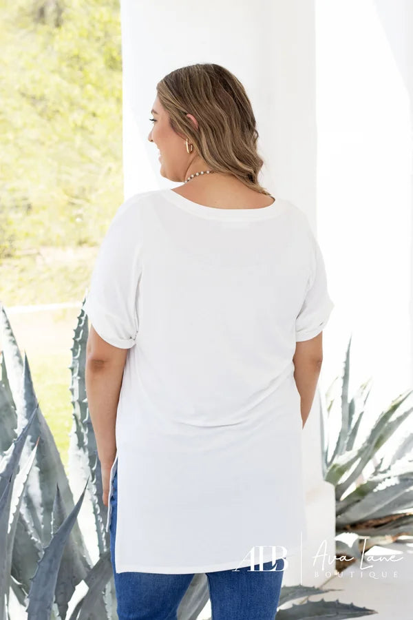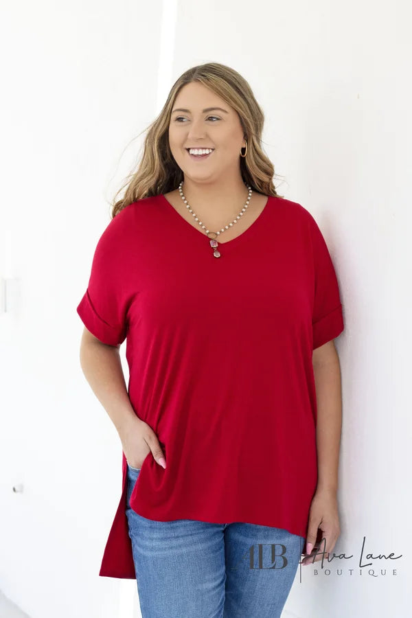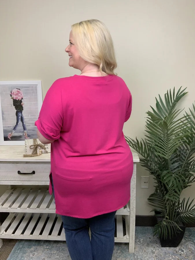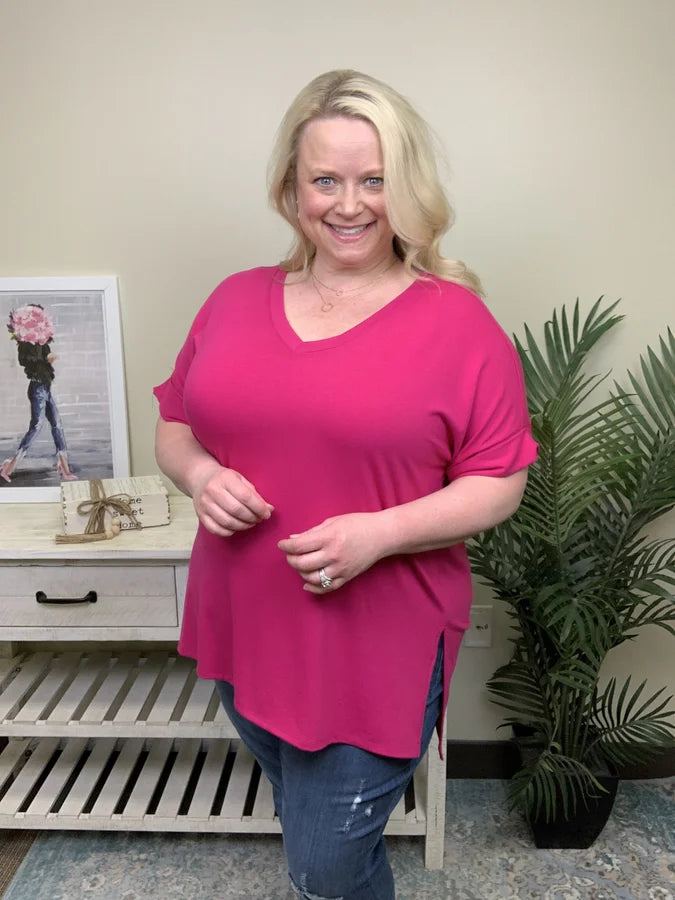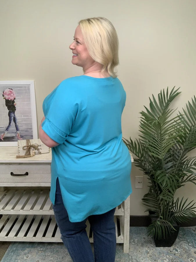 The Its All Going On Top By Zenana has it all going on! The V neck is perfect! The side slits make sure this top lays perfectly on you! The high low hem and rolled sleeves finish this top out for a perfect look for anything you've got going on!