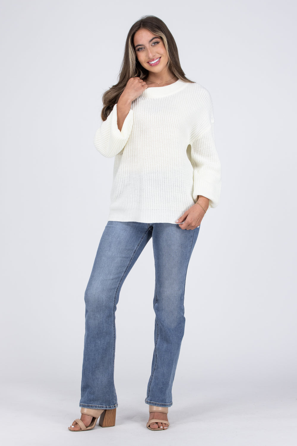 The It's What's Inside That Counts Sweater from Andree by Unit is perfect for those who want to be seen for their true selves, and choose to see others the same way. It features long balloon sleeves with dropped shoulders, rounded neckline and a straight hemline with flattering side slits. Pair with your favorite denim and booties for a cute and cozy look.