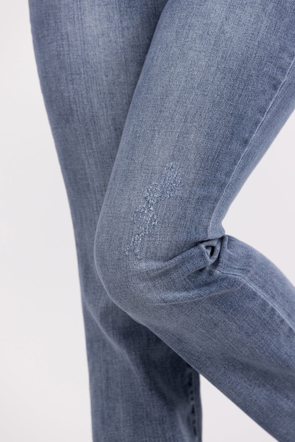 This light wash bootcut jean strikes the perfect balance between fitted and relaxed. With a flattering mid-rise waist and a gently flared leg, it’s designed to enhance your shape through the thighs and knees before flaring out just right from the knee down. Subtle whiskering and soft scratch details on the left knee and back pockets give these jeans a laid-back, worn-in look without going overboard.