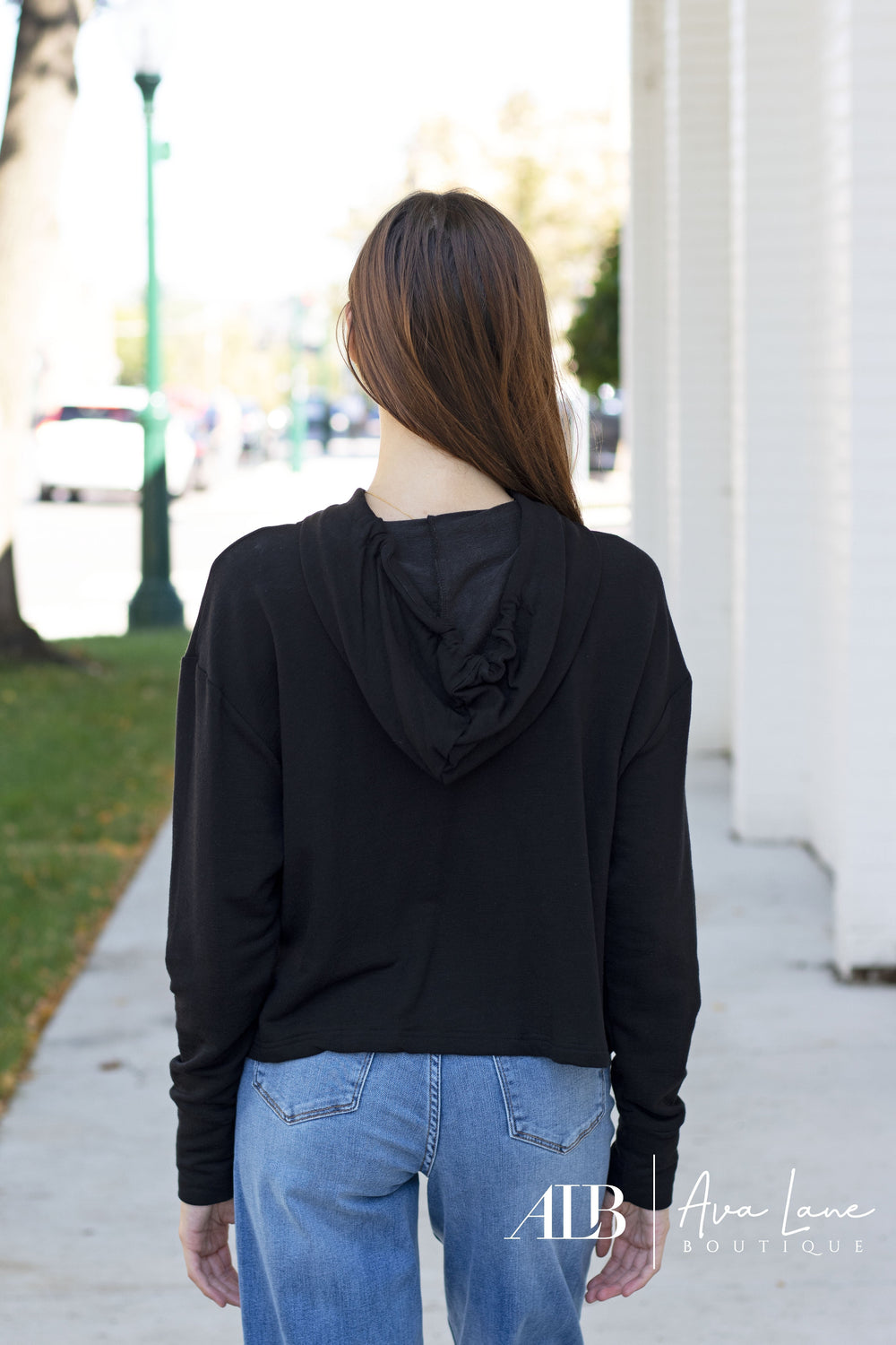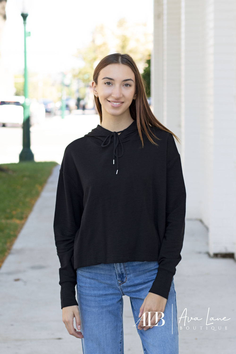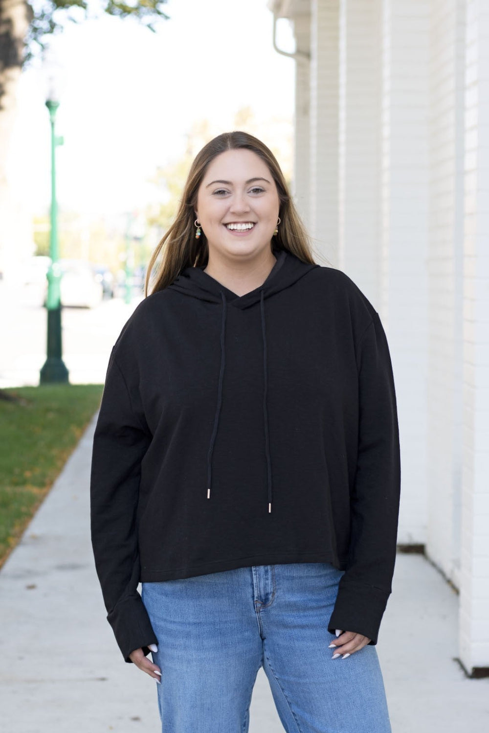 Keep It Short and sweet with this cropped sweatshirt from Mono B. It features a hoodie with drawstring closure, long sleeves, and loose, boxy silhouette for a casual look. Wear this over your Mono B activewear for an easy cover-up.